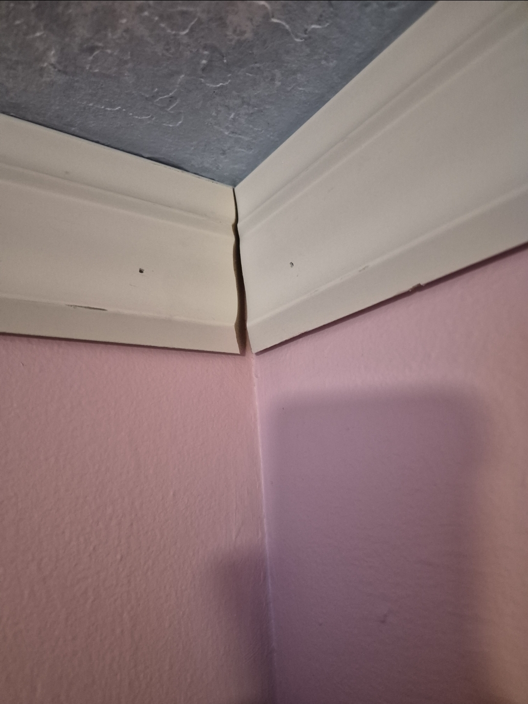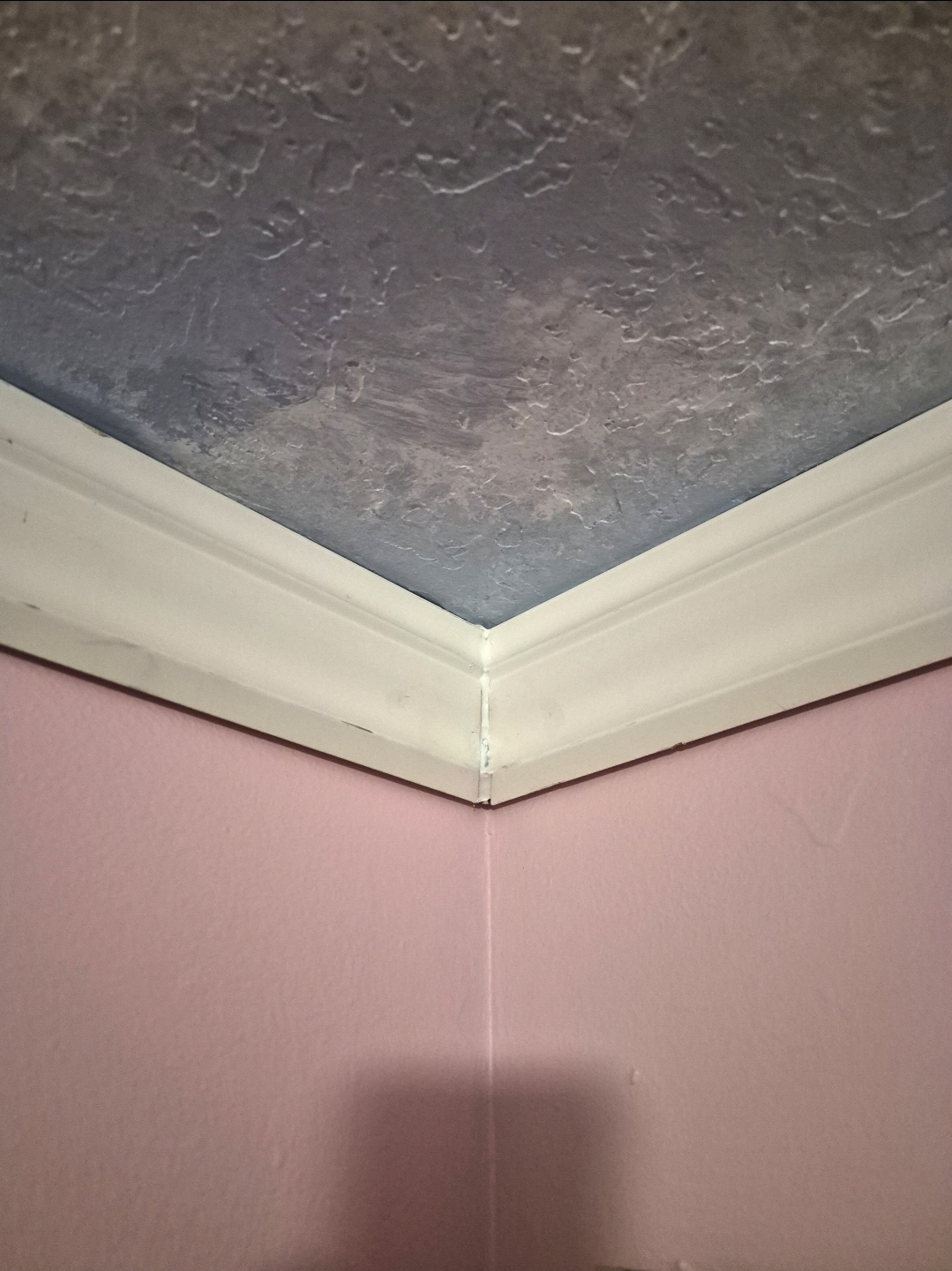 Crown moldings should be attached to the ceilings, not the walls. Unless your picture is upside down, 'cause that gray shit looks more like a floor tile. What the fuck is going on though? Pink, white, and gray? What fucking retard cut that molding? The same retard that takes a photo and then screenshots it? Why are there gaps at all? Every single edge on that looks like an utter dumpster fire. Normally you have to be in congress to fuck something up that badly.