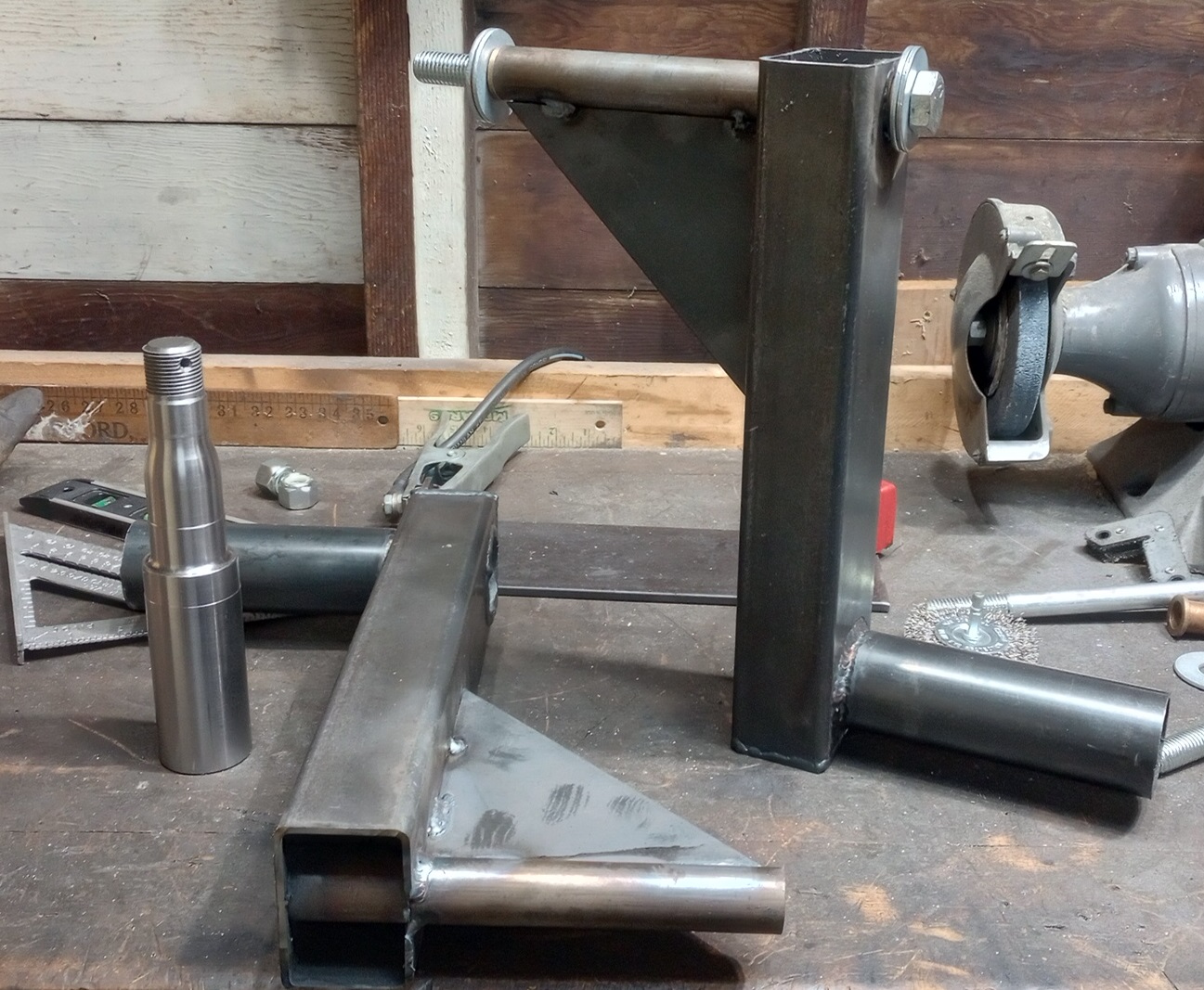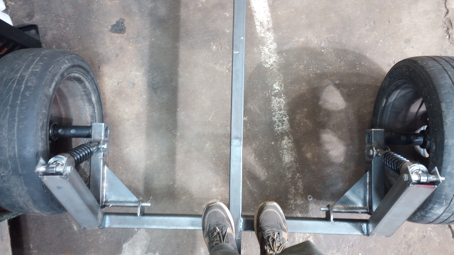 >>2972986im building a single place motorcycle trailer, but with cool coilover suspension. these are trailing arms(not done yet). the axle stub fits in the bigger tube im using car wheels so I needed that offset and then hopefully the gusseted dogleg will help with side loads. I have a pair of harley vrod shocks, I havent worked out the angles but I think it'll work. Imagine a central 2x3 beam and then two other 2x3s sticking out like a cross and these arms will be hanging off the ends.
