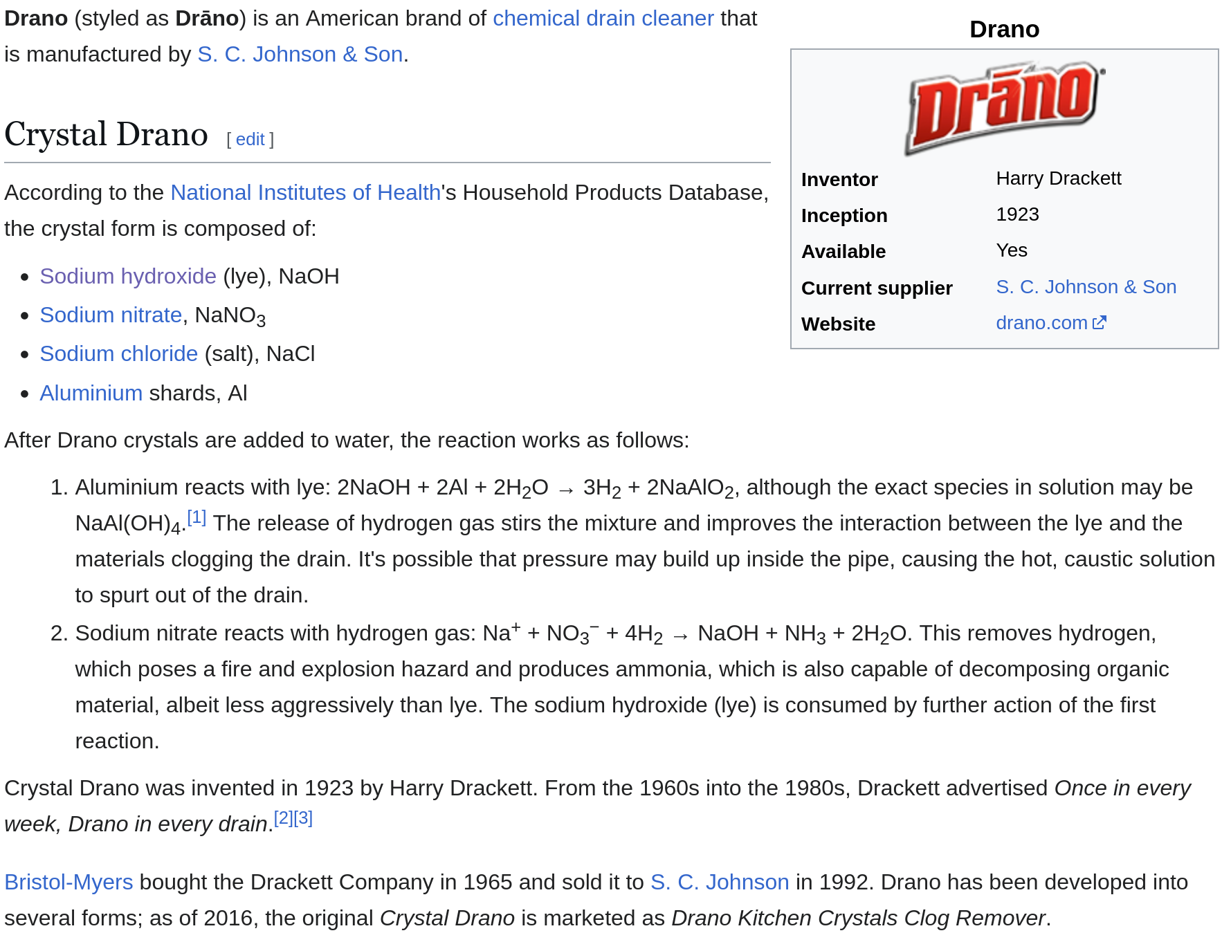 >>2973734draino is not sulfuric acid, it's basically thickened bleach. it used to be a complex mixture of powder that you dumped down the drain. not sure if you can get powdered draino anymore.sulfuric acid is very nasty stuff, I would not use it to clear a drain. it can stink you out of house and home. ask me how I know.