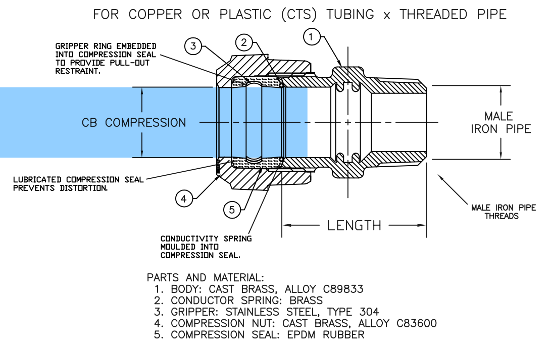 >>2974284It does resemble the rear part, though on mine it's just plain hex without nubs.I found the manufacturer of my part "Cambridge" and browsing their catalog the closest item I've found is in pic related drawing. I added the blue to show the water main pipe. Only difference is that the "(1) body" on the drawing has a male end while mine is female.I think it's safest to assume that it's 2 parts of a compression fitting and that if the outermost threads are ruined from corrosion with the galv. pipe I should be prepared to replace the entire brass fitting. (unless the "(4) compression nut" has standard NPT threading?)