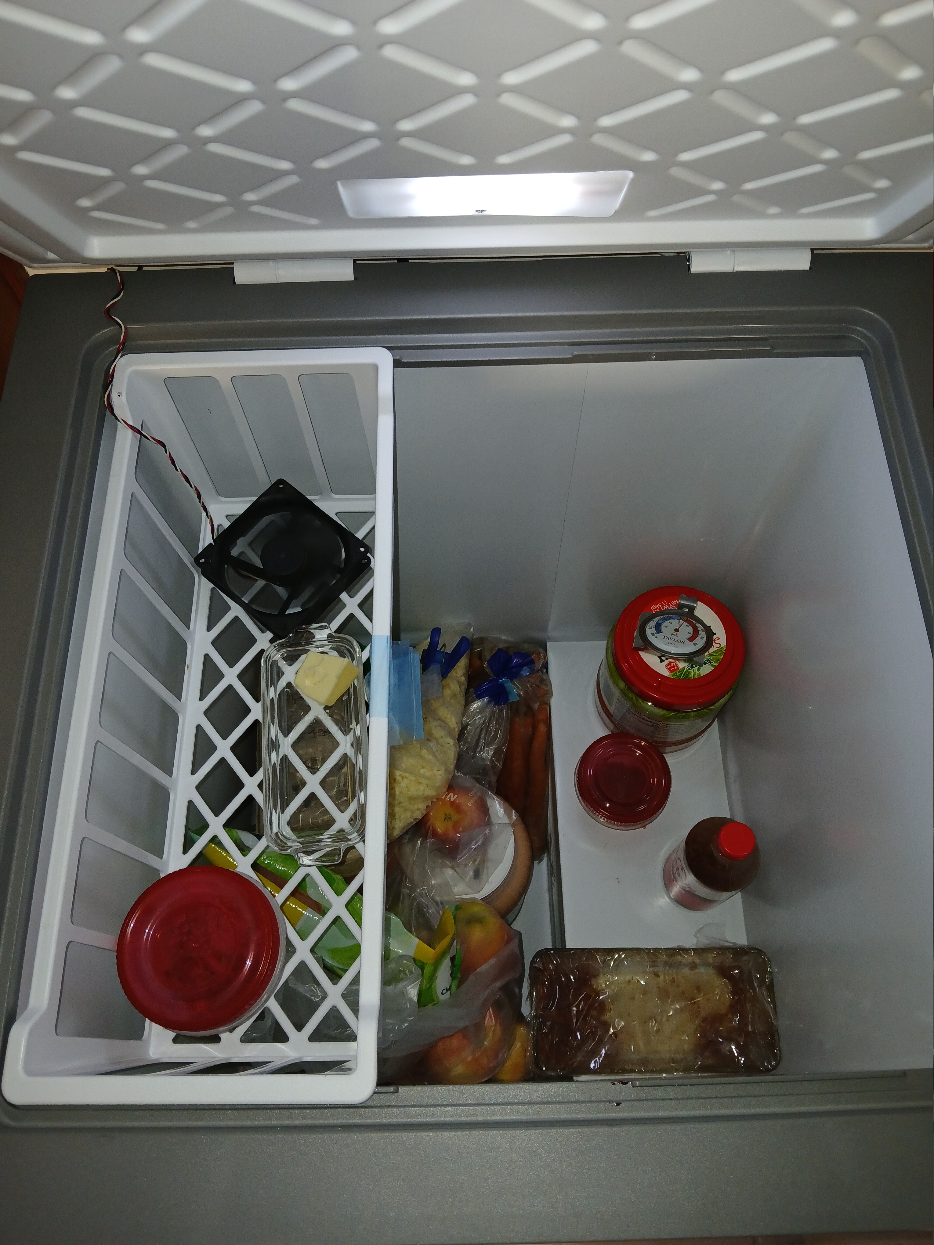 Then I found a 5 cubic foot chest freezer that is designed to be switched to refrigeration. This one was new open box for $70. I noticed on some off grid forums these have bad air circulation so I added a PC fan to even things out. Still the lowest refrigerator temperature range is barely below 40. If you turn the dial farther it clicks to a new range that is maybe 10 degrees Fahrenheit. The upper end of the refrigerator temperature range is quite high. This sort of chest freezer might be good for storing vegetables in summer with very little energy.