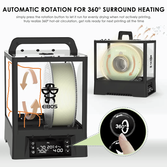 humour.>>2980580thermodynami-cysts of /3dpg/, I've had this eibos dryer for a few years now but only recently acquired the tech to verify it's claims. I haven't had any issues with it, but I'm wondering if filling the empty space where the second spool would go help the heating of the spool I'm printing from. I only ever use the second set of rollers when I'm printing with 3kg spools, and that's mostly pla and abs 3kg spools so drying doesnt matter all that much. The ui is set to 70c, but the spool is only 60C, at best.
