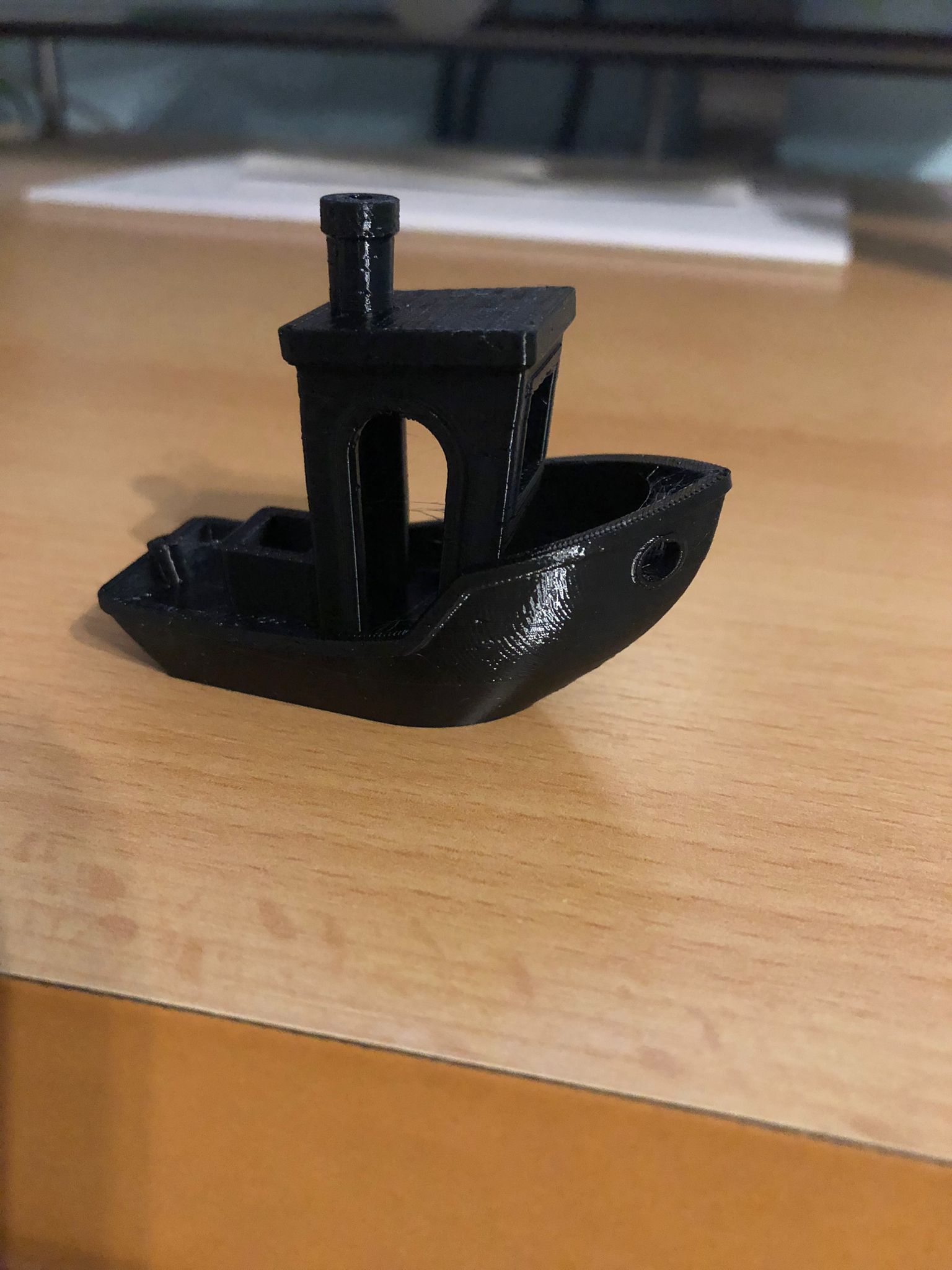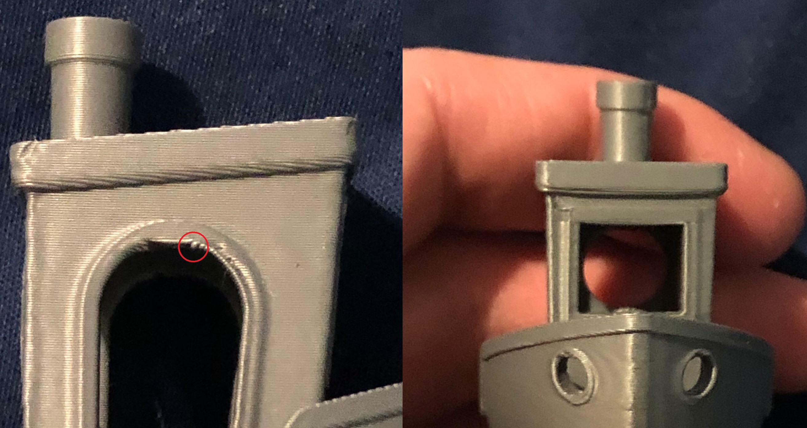 >>2980913>How thick I would say 2 maybe 3 layers wide for the vertical support and 4 or 5 for the vertical bridge.>and tall do you suggest those beams should be?I would start a bridge right beneath the part where the two sides start to "lean" into the middle.>doesn't printing the entire bottom support at once, in a single layer, covering 4 mm unsupported be worse than printing the arch?here is the thing. You can get away with quite a lot of bridging, compared to arching. The bad part with arching isn't the unsupported part where you are crossing from one side to the other, but rather the couple of layers right beneath the final bridge. Because that's where the biggest overhang happens.See pic related for what I mean. On the left side you got an arch and the red circle is the layer with the most overhang. You can see how it wants to sag more than the layer above it that has even less support. But this layer actually bridges from one side to the other.On the right side you got a bridge that is 10mm wide (sorry for the bad focus) and no real problem bridging it. Yeah, the first 2 or 3 layers sag maybe a little bit, but layer 4 and 5 are already horizontal again.And just FYI this benchy was printed with ASA+. PLA is even better at bridging and overhangs because you can blast it with your fan 100% to cool it down even faster.And I wouldn't even worry about your 4mm arch. Actually you might get away without any kind of support.Hope you learned something anyway. Good luck and happy printing.