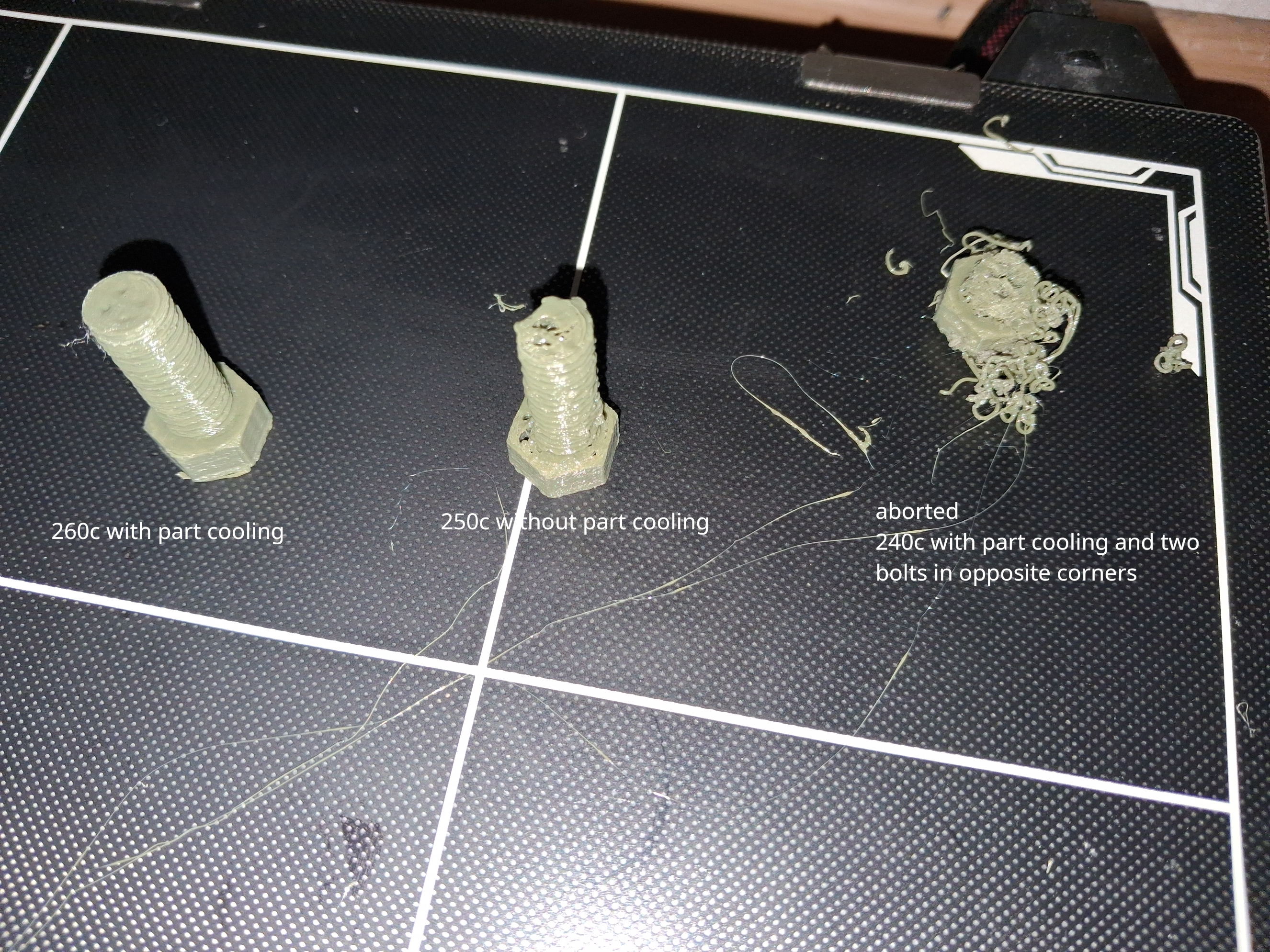 >>2983707>The anon telling you to go hotter was being facetious. It's obviously too hot.Well I didn't know that so I tried and it worked.I did however also change part cooling at the same time so that could have been a factor but the 240c print with two bolts in opposite corners was a failure.I'm a bit confused by it all but at least I have some parameters that work, even if I don't entirely understand why.I'm trying it again with a different part now that was also not very good.