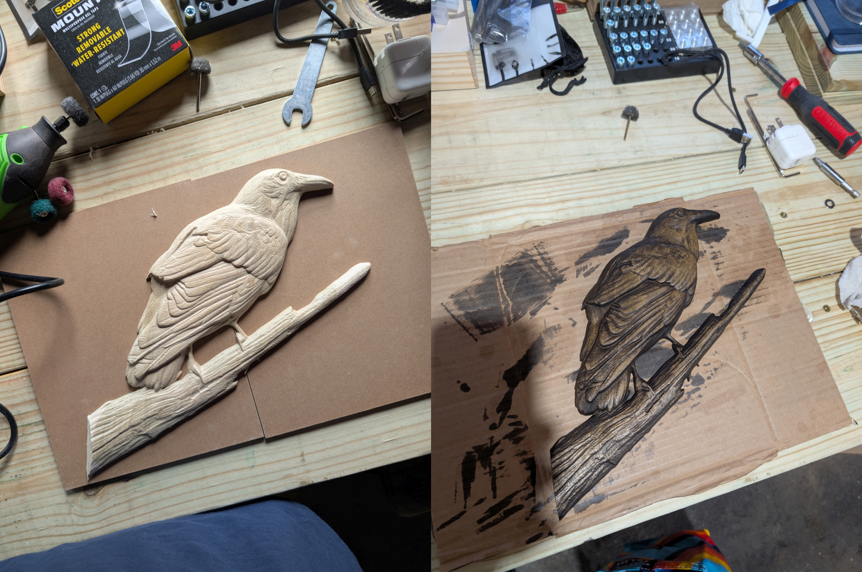 >>2980846>i feel like the stain pooled too much at those corners where the feathers "overlap", but that's just me.same, have a feeling I waited too long before wiping the excess, used too much, or didn't stir the can well enough beforehandi used minwax dark walnut + wood conditioner on poplarstill like how it turned out, except for accidentally breaking the branch when I was peeling it off the wasteboard. at least it was easily fixable