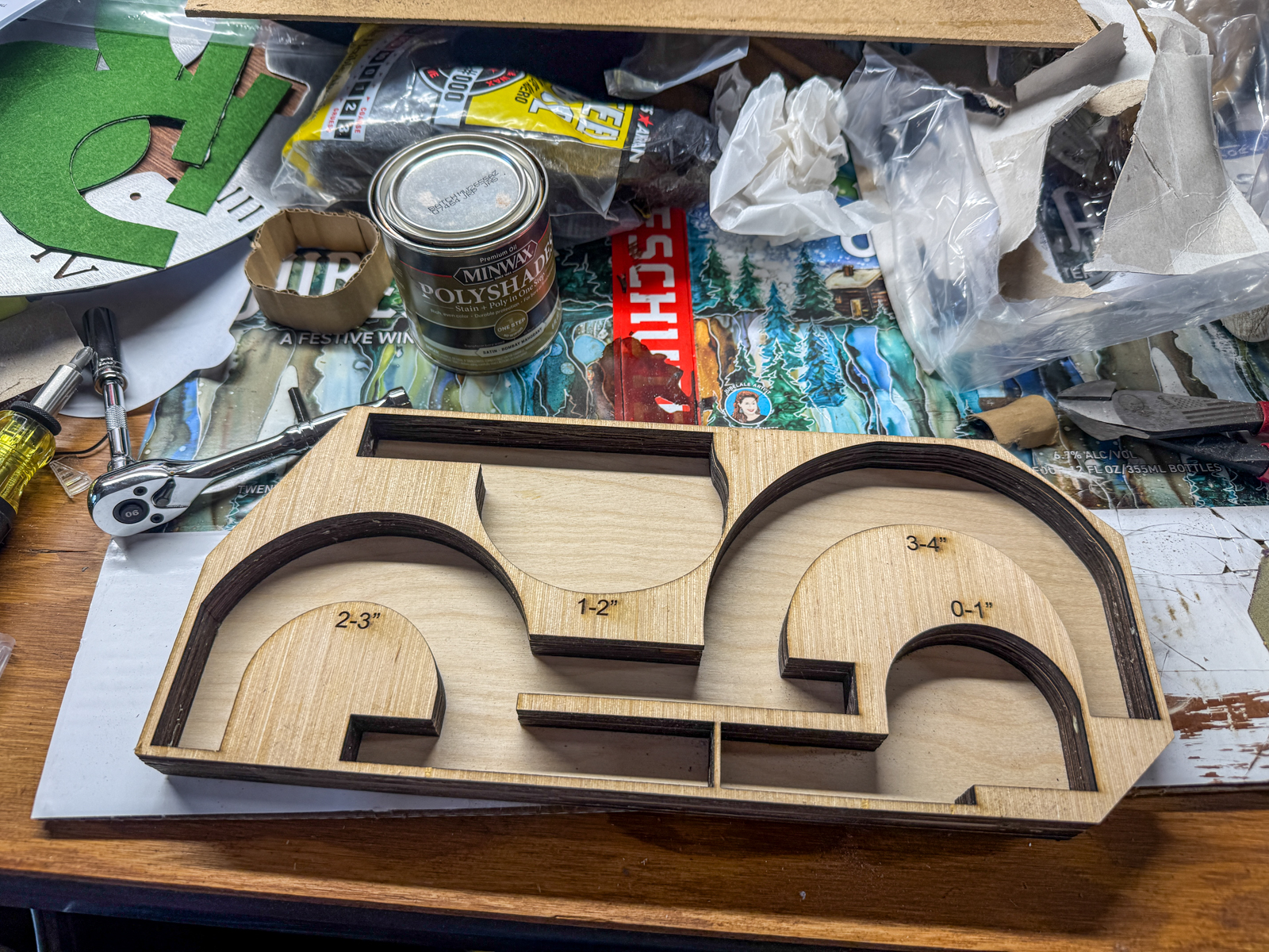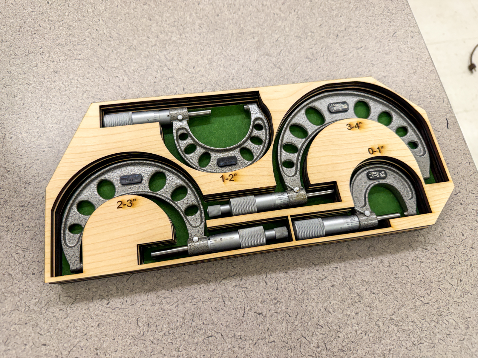 Got it glued up, not perfect but more than good enough for government work. You'll notice the different grain, I'd actually engraved two top layers and the one in the previous pic cracked at the thinnest part (you'll notice it if you look close in the previous pic) so I made it a lower layer. Now I just hope it actually fits in the toolbox where it needs to go, felt like it would when just holding the stack but it's close, the corner cuts are to allow it to angle into where it goes.