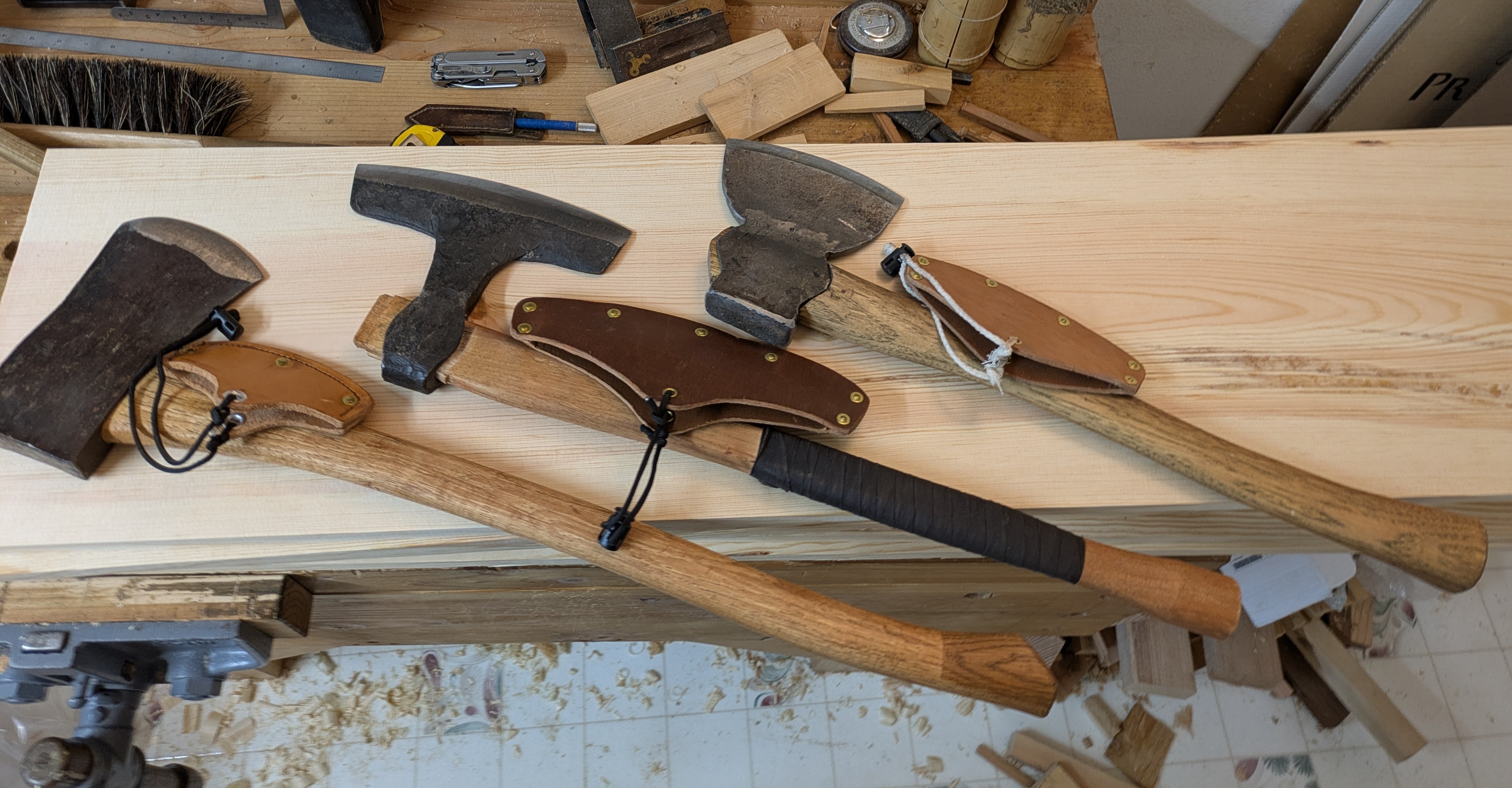 >>2981237I use a normal 4 lb felling axe, but on a 32 inch handle for roughing. Handle length is subjective though, but I find the shorter length is better for cutting the notches for juggling, otherwise you tend to hit your abs when trying to cut the upper part of the notch. It was just an old antique head. The important thing is to thin the cheeks well if it needs it, and to thin the handle since those mostly come too thick and rigid. The hewing axe I forged myself. It is in the medieval style, so relatively light for the broadness of the bit (~10"), as they are pretty skeletonized. This let's me be more accurate imo. But if you stay away from the 8lb heads you will likely be fine. Those were meant for busting out railroad ties back in the day. You don't need much broadness to do good work really, it is just slightly faster. I started out with a 4" hewing hatchet head. ~6" is probably good, or a little more. You can always move up as your get stronger and more skilled. Accuracy matters a lot, as well as some theory of how wood grain works.