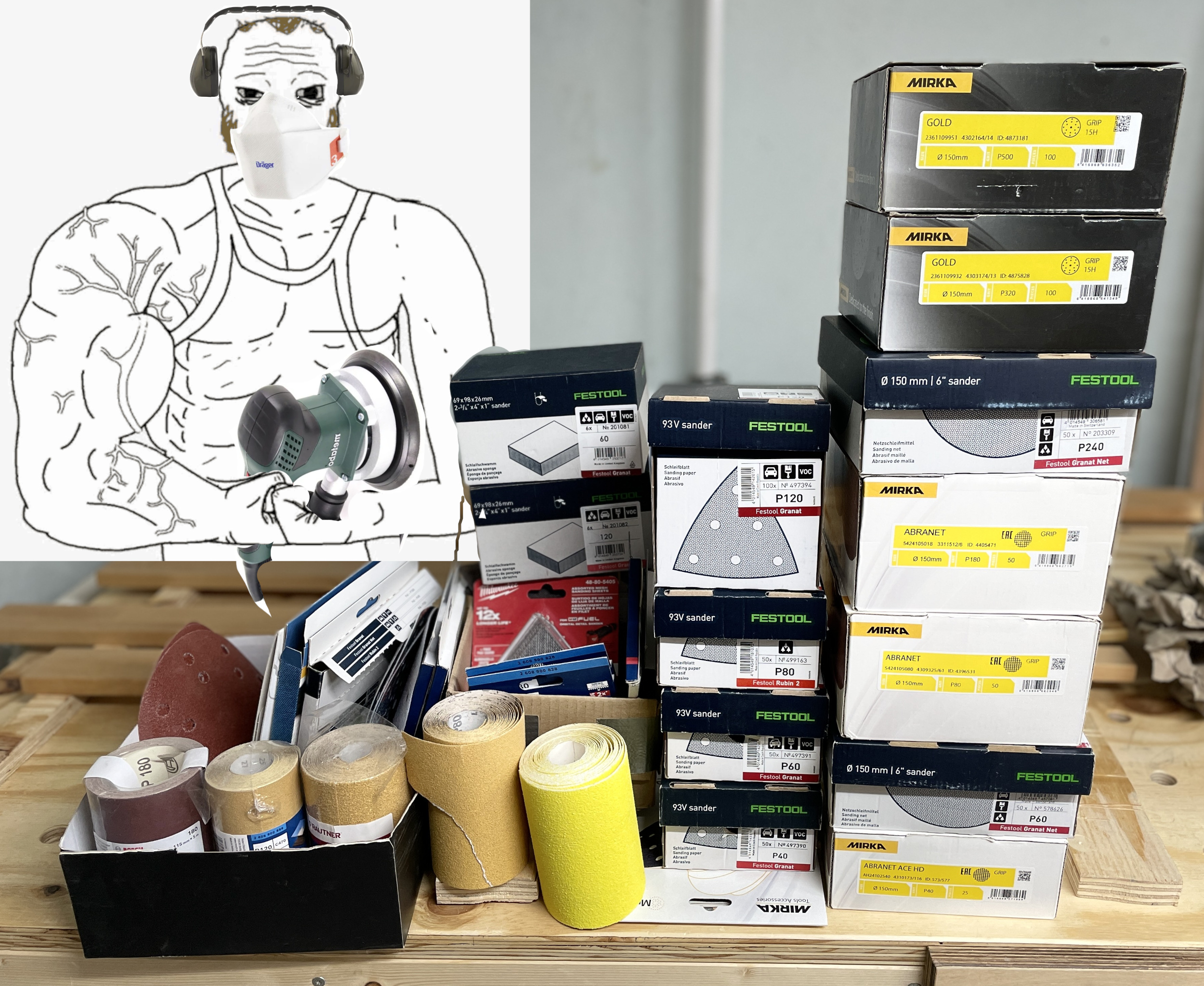 >>2982790>richfagNot really. If you buy the big (25-100pc, depending on grit) boxes, Festool (or mirka, for that matter) is much cheaper per piece than buying singles or 5-packs of shitty ass no-name paper from the big box store. Only issue is Festools proprietary hole pattern, but their mesh is just, well, mesh and their delta paper don’t match Bosch et als holes but you can simply drill the Festool pattern into a cheap Bosch replacement head for dust extraction. >>2982842Yeah baby! Going coarse!