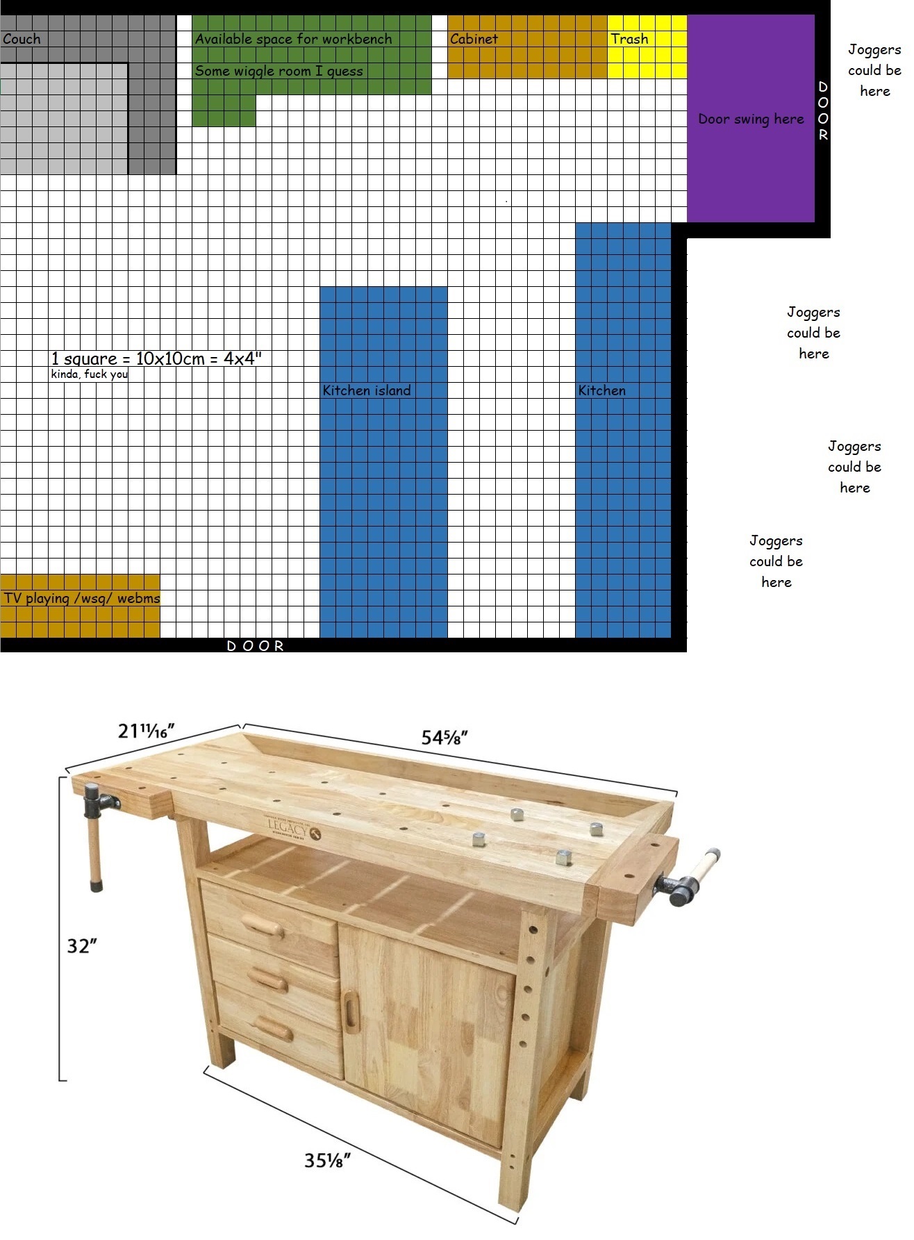 I want to do some handtools-only woodworking in my rentcuck apartment. I have a roughly 150x50cm (60x20") space available, picrel. Would this suck donkey dick or is it actually workable? Can I do anything to limit (for example) hammering sounds from traveling to my downstairs neighbor?I was thinking of building something like the thing at the bottom of the image, but without the trench and putting the legs on the corners to allow for more storage space.I don't have any experience and I'm retarded so I can't tell if this is a retarded idea.