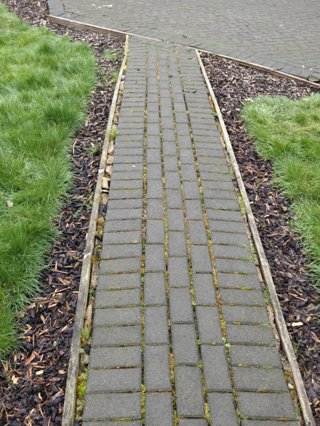 Yeh that just looks home made, compared to the ones in the top of the picture.The edge there could be done for several reasons, but its hard to tell from that picture alone. If its above the ground on the sides, it needs something to hold it back, otherewise the edge is gonna slant down over time. I would take it up and lay it back, in similar style to the others. Or if thats too hard, just do interlaced pattern.You wont need concrete on this, since its too small to drive on. But paths where a car gonna drive need concrete poured at the sides, just below the surface to hold the bricks in place. Otherwise they are gonna get gaps between them.
