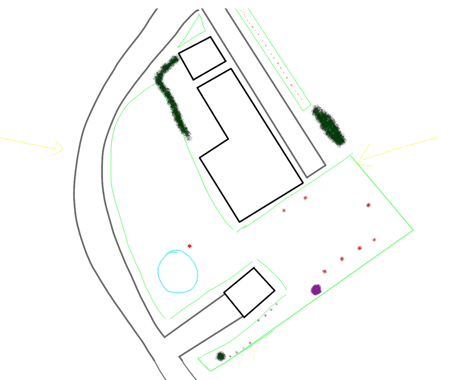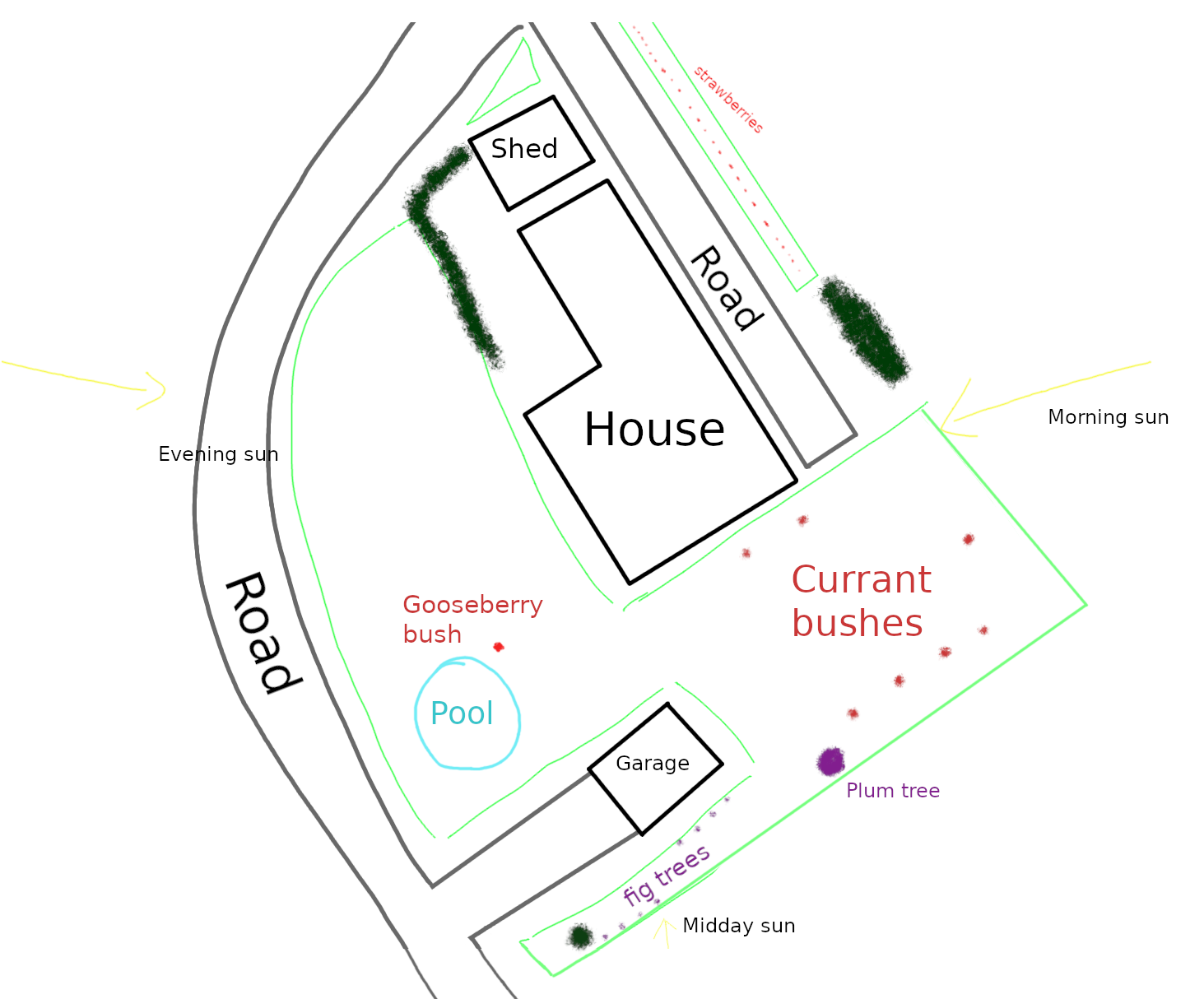 With the world going the way it is, I'd like to grow as much food on my own yard as possible and could use some advice and suggestions on what to do with it.Here's a map of the yard with everything currently growing on it. My current plans are to plant a third row of currants in the eastmost yard, possibly a hedge of chokeberries along the road, and I'm thinking of planting one apple tree in the triangular batch of grass behind the shed. Beside those, the large front yard next to the road is currently entirely unused, so how would you optimize it's usage? Any other tips I should take into consideration?