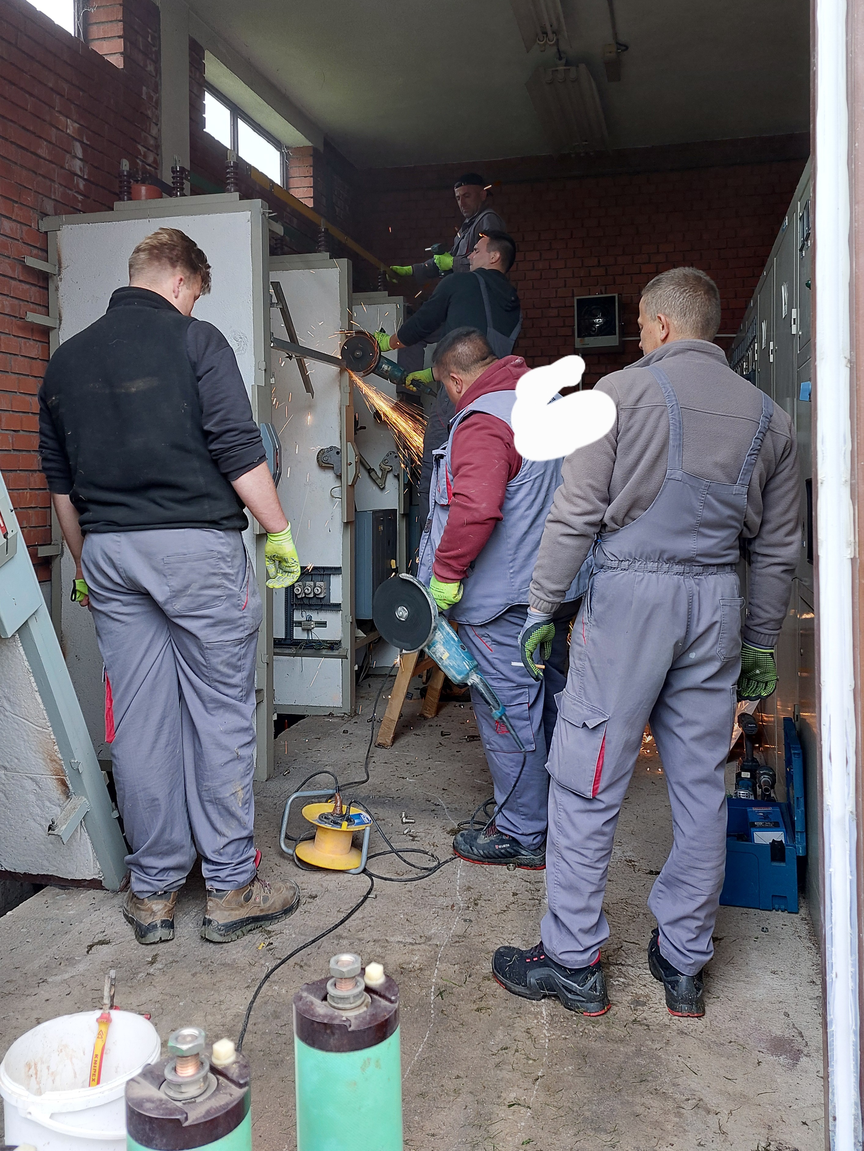 >>2986577whats that aspiring foreman up to? cutting electrical substation equipment with a nine inch grinding disc and no eye protection?