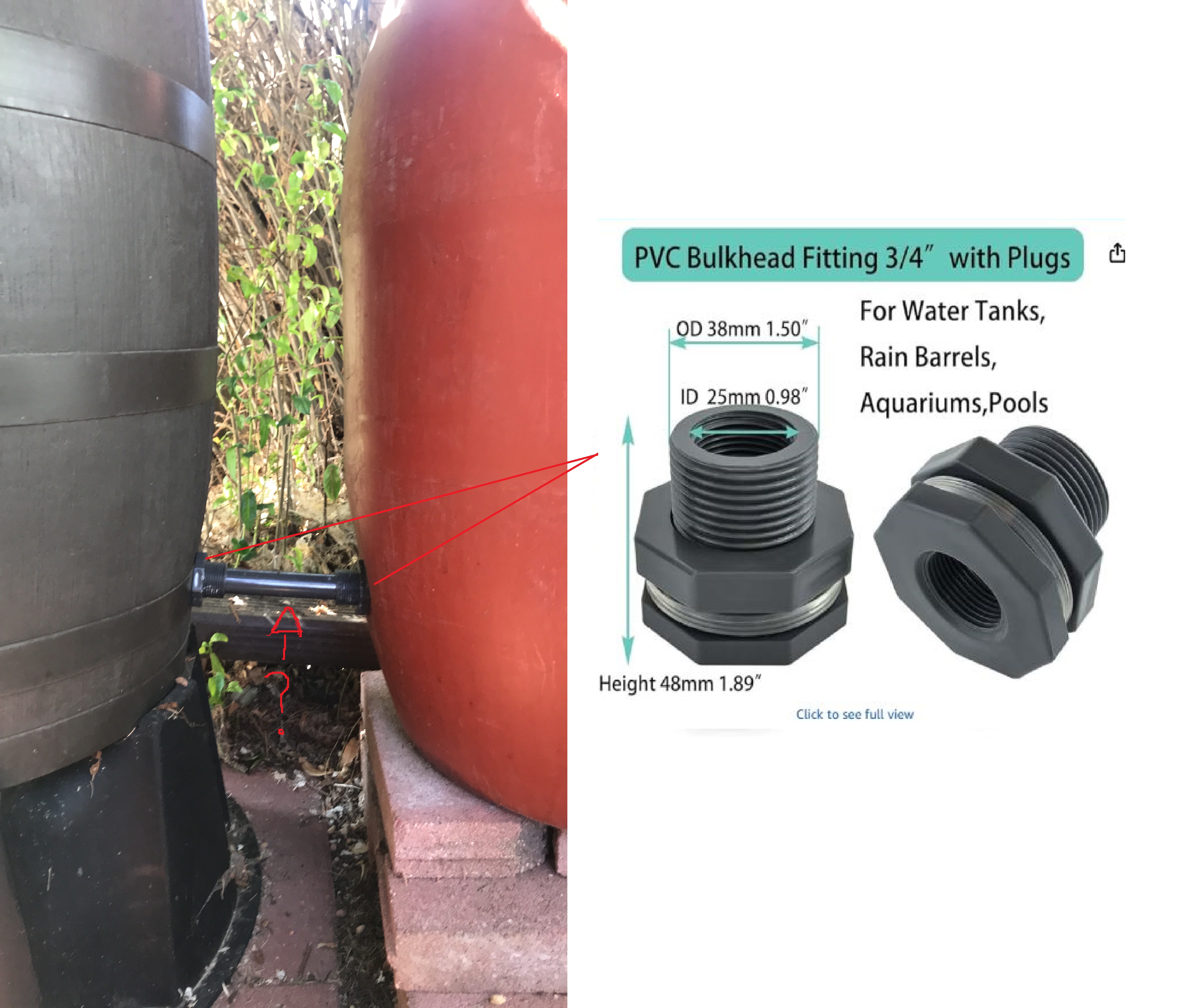 Ive got the plugs shown in the image. Trying to connect (2) 55 gallon rain barrels. Ive tried kits like this ( https://www.ebay.com/itm/127756959107 ) but they're garbage and leak - the threads / plastic are too flimsy and jump when trying to screw together.Any idea what sort of pipe is used in the image with the question mark? The plugs are threaded on the inside but it appears like they just rammed a pvc pipe between the 2 barrels. Not sure how they sealed it together.I appreciate any advice.