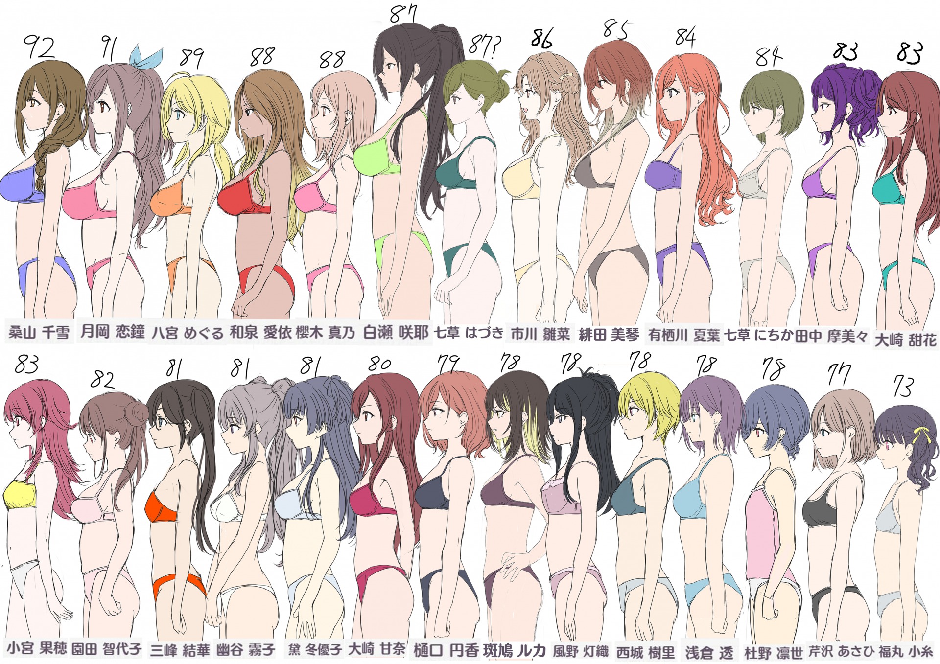 Bust charts, etc.Anything with girls comparing breasts with each otherBonus points if its official art