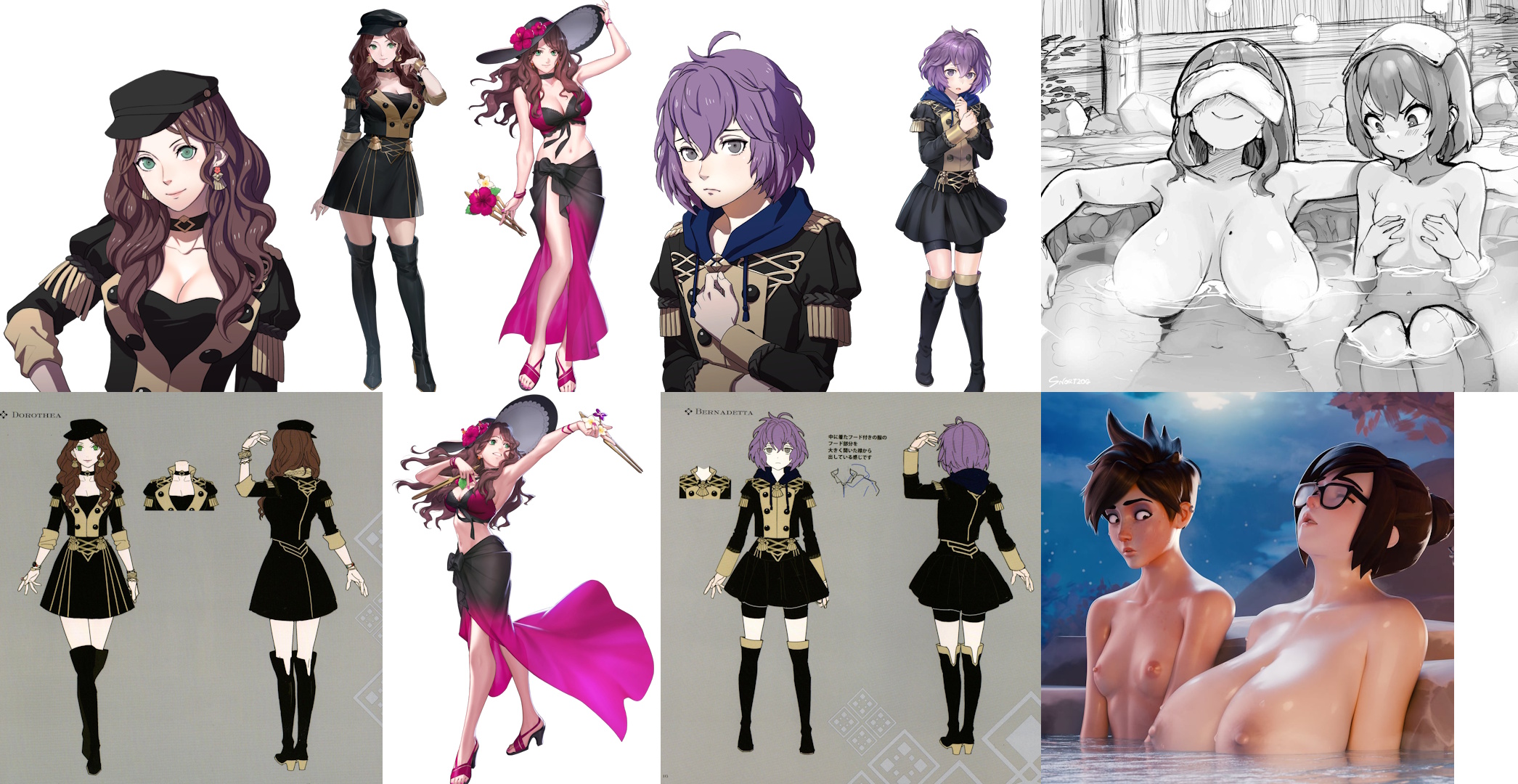 Requesting Bernadetta from Fire Emblem: Three Houses getting shocked at the size of her friend, Dorothea's massive, ample breasts.A solo shot of Dorothea taking a bath/in the sauna is great, as well.