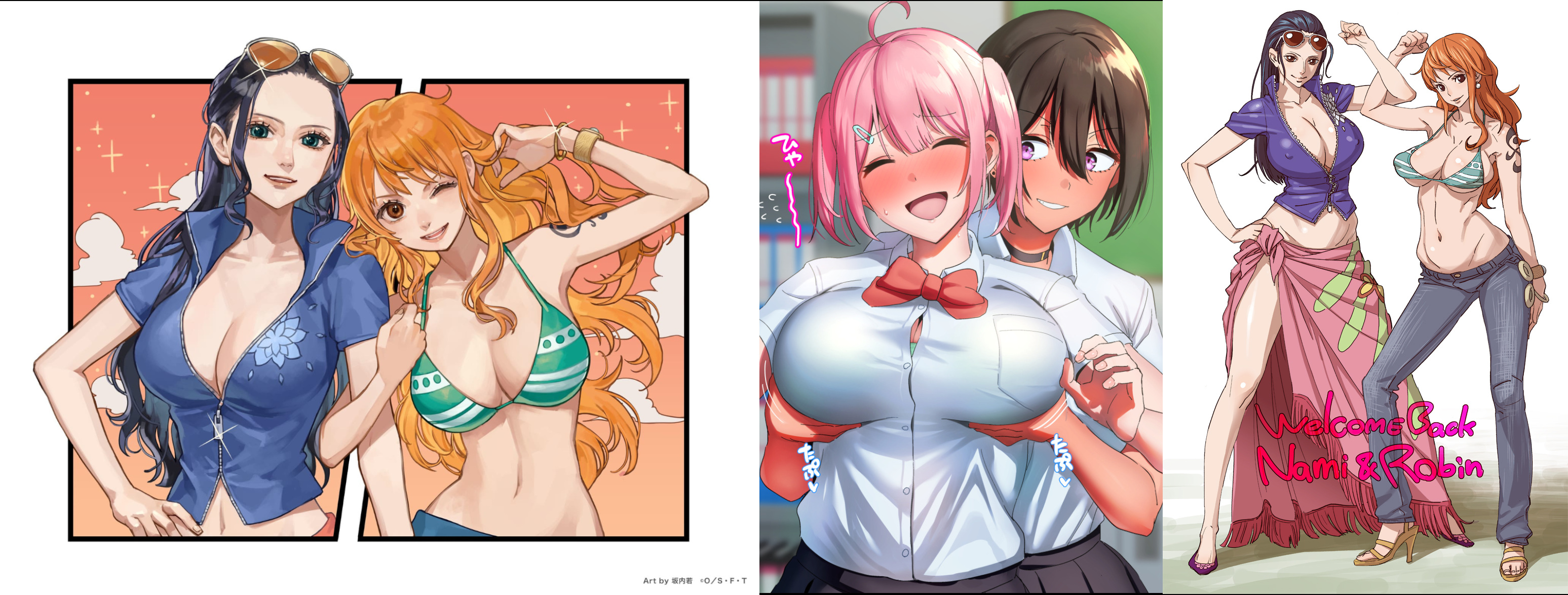 Requesting Nami behind Nico Robin, happily playing with her chest