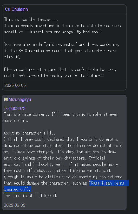 >>3000230I think the Mangaka has actually started whoring herself out on her fanbox too, but those posts aren't on kemono so I'm not sure.