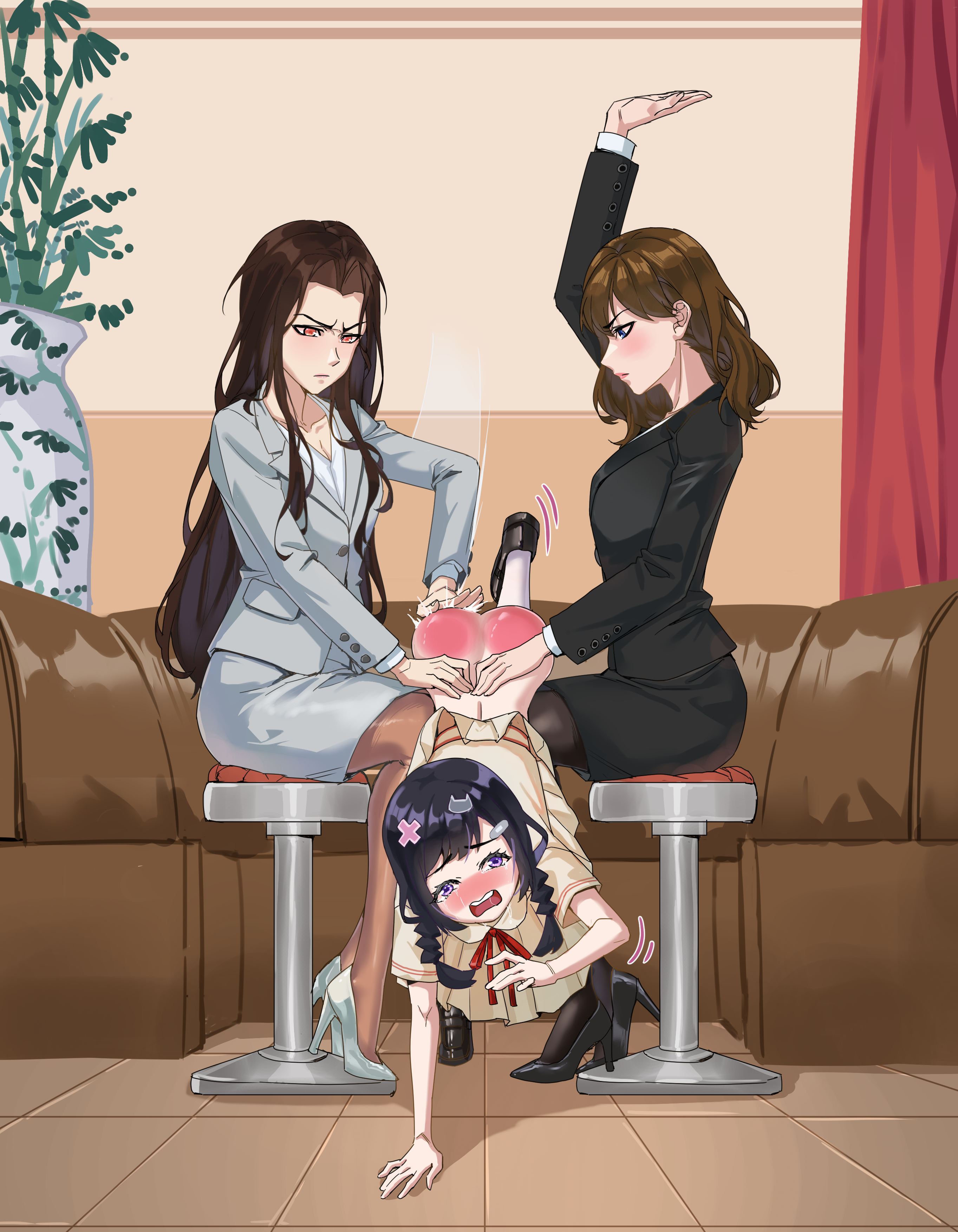 >>3006221It's nice, especially IRL I've spanked a few girls like this bracing their selves against a teacher's desk and it was really fun and made for a good picture, though I prefer OTK. If the girls are petite enough and you have the right kind of furniture you can drape two girls over your lap fairly comfortably and have a lot of fun, or straddling each leg is also nice. Otherwise, the best bet is to have the girls holding each other in place (holding the gorls arms and/or legs) while you spank one at a time and rotate through them continuously. Also very fun if you have the other girls assist by getting their own spanks in. Girls thrive in group environments so it ironically makes them more compliant if they can join in and then play their role by going otk when it's their turn. Otherwise you'll want to tie them up somewhere where they can watch but not get away or have someone hokding them at bay and possibly teasing them about what they have in store for them such as here >>3006754One thing I haven't tried, but that I think would be really enjoyable if spanking one girl otk while the others are on corner time bare bottomed. That way they're alone with their thoughts and getting tormented by their imagination as it fills in the blank with the missing visuals to the sounds that they're hearing and you get to admire all three girls bottoms and the control your exerting over them all, and then you're free to swap them out at your leisure.