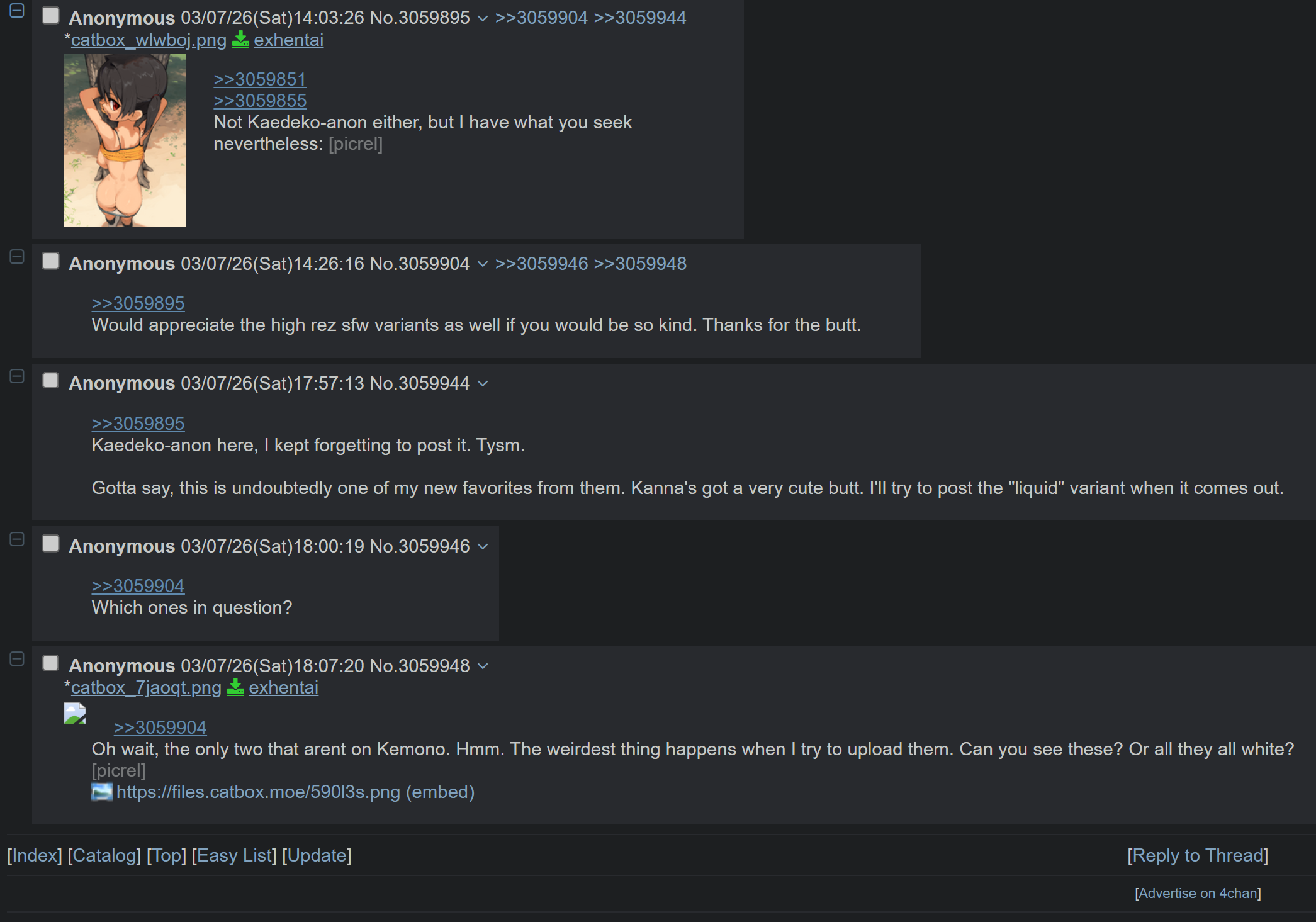 >>3058139I see her armpit and bush pics but I cant find the butthole one.Is it not on kemono yet?