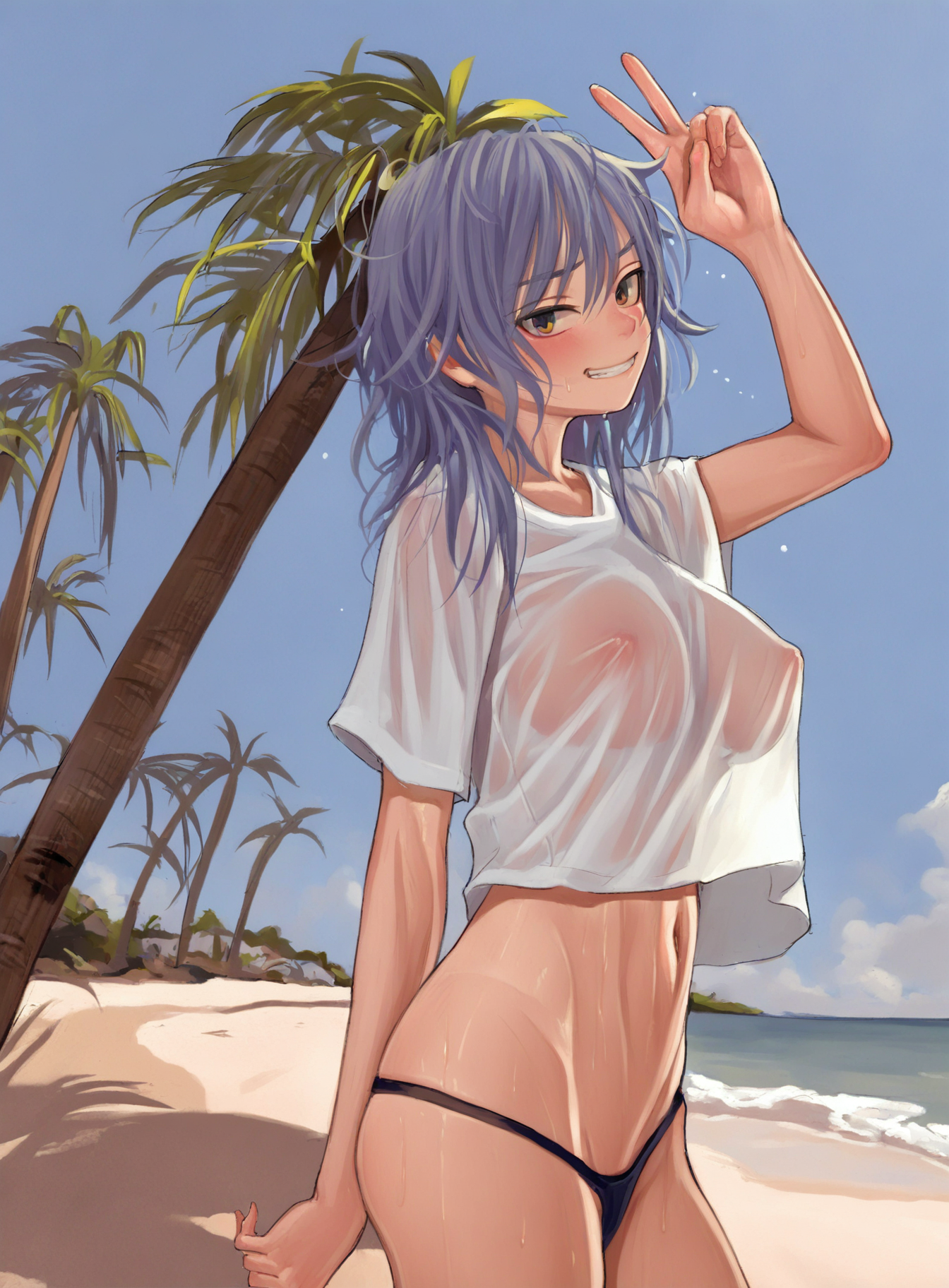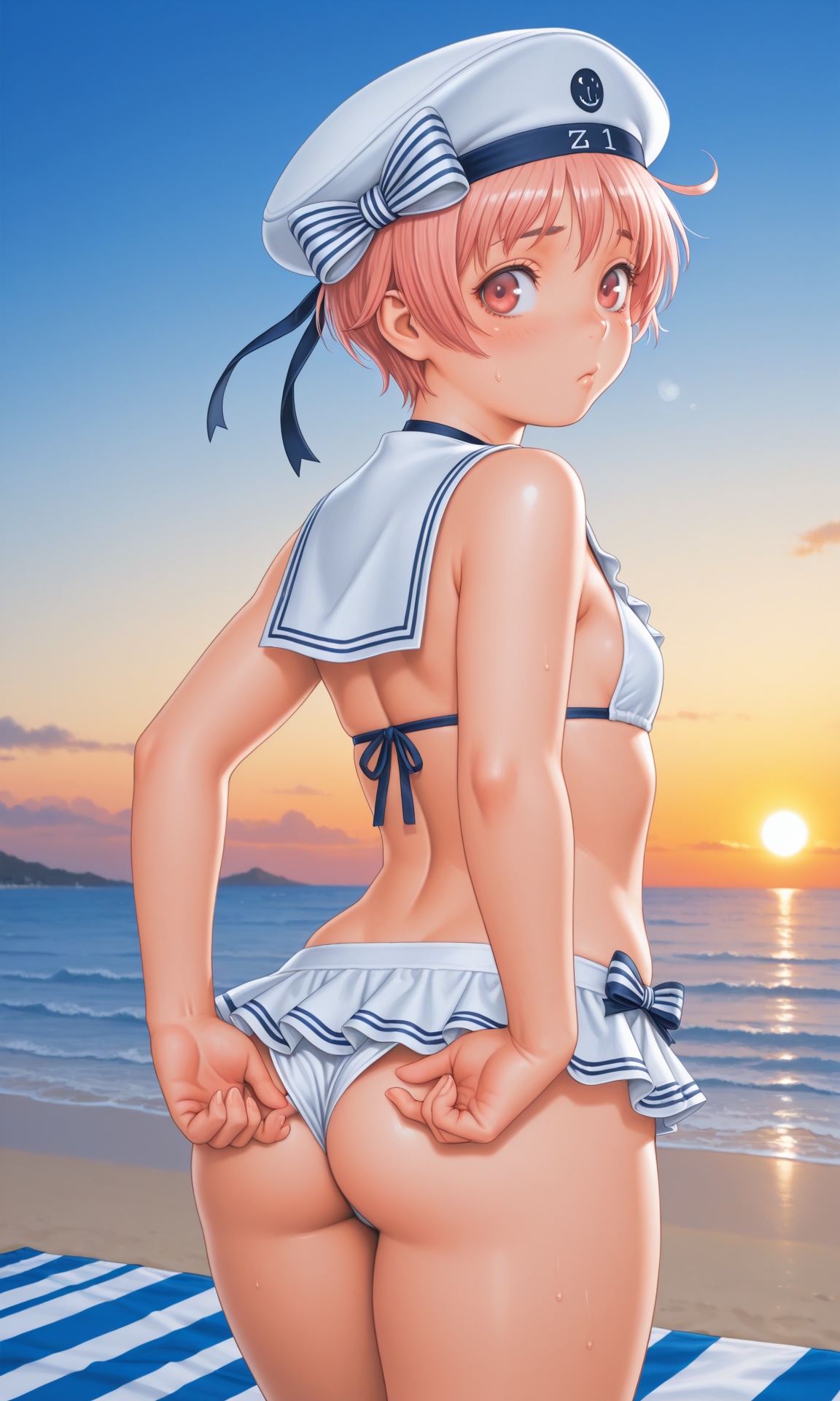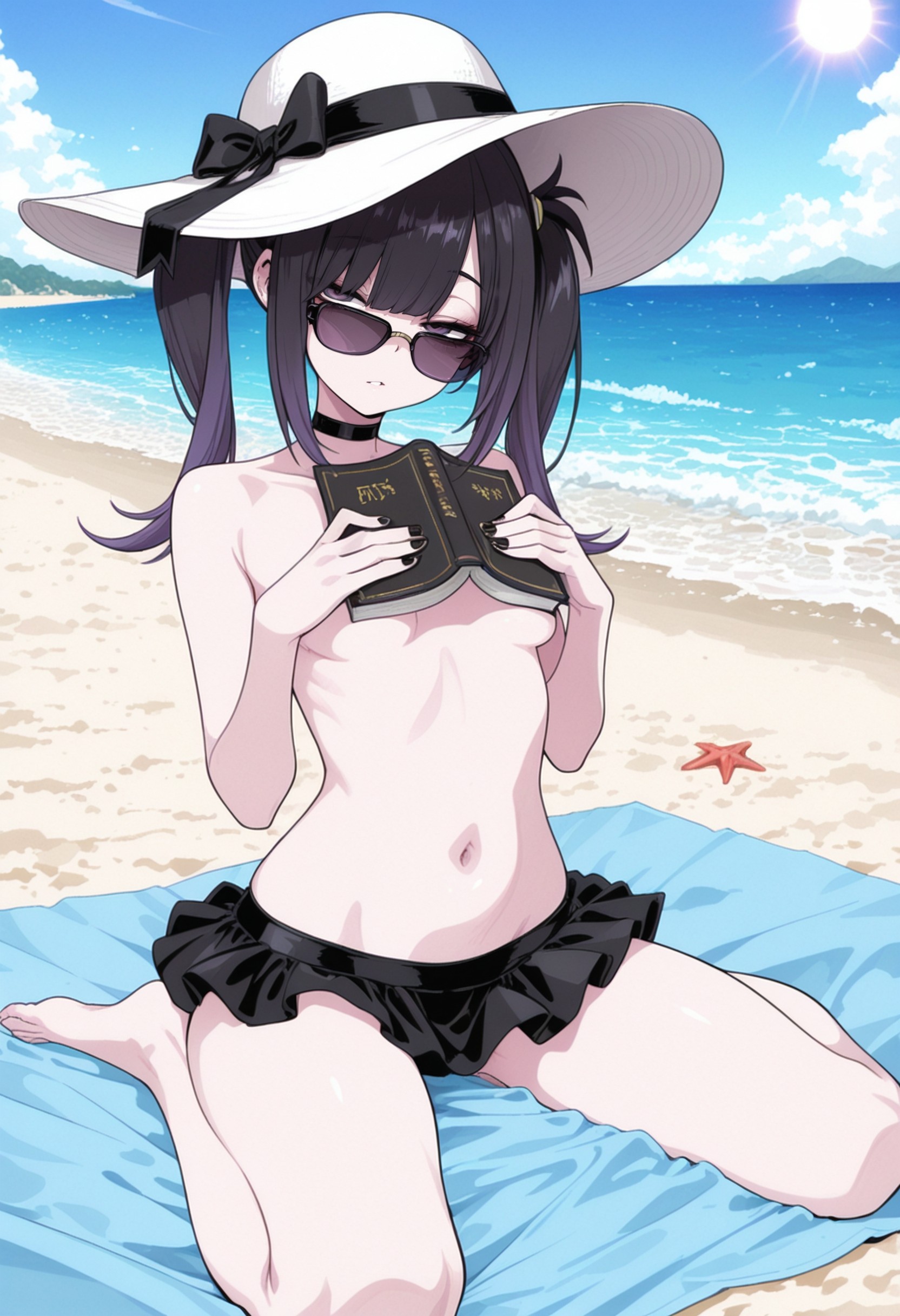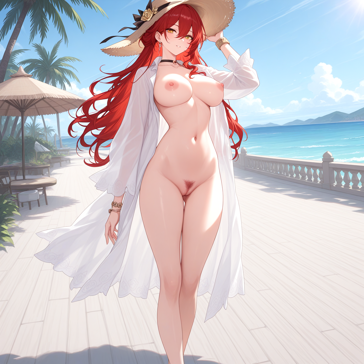 >>3034237Kaoruko Sazaki (Gundam) naked at the Beach. She is standing, legs apart. She opens the towel, revealing her naked body. She has a mischievous and provocative look in her eyes and looks at the viewer.