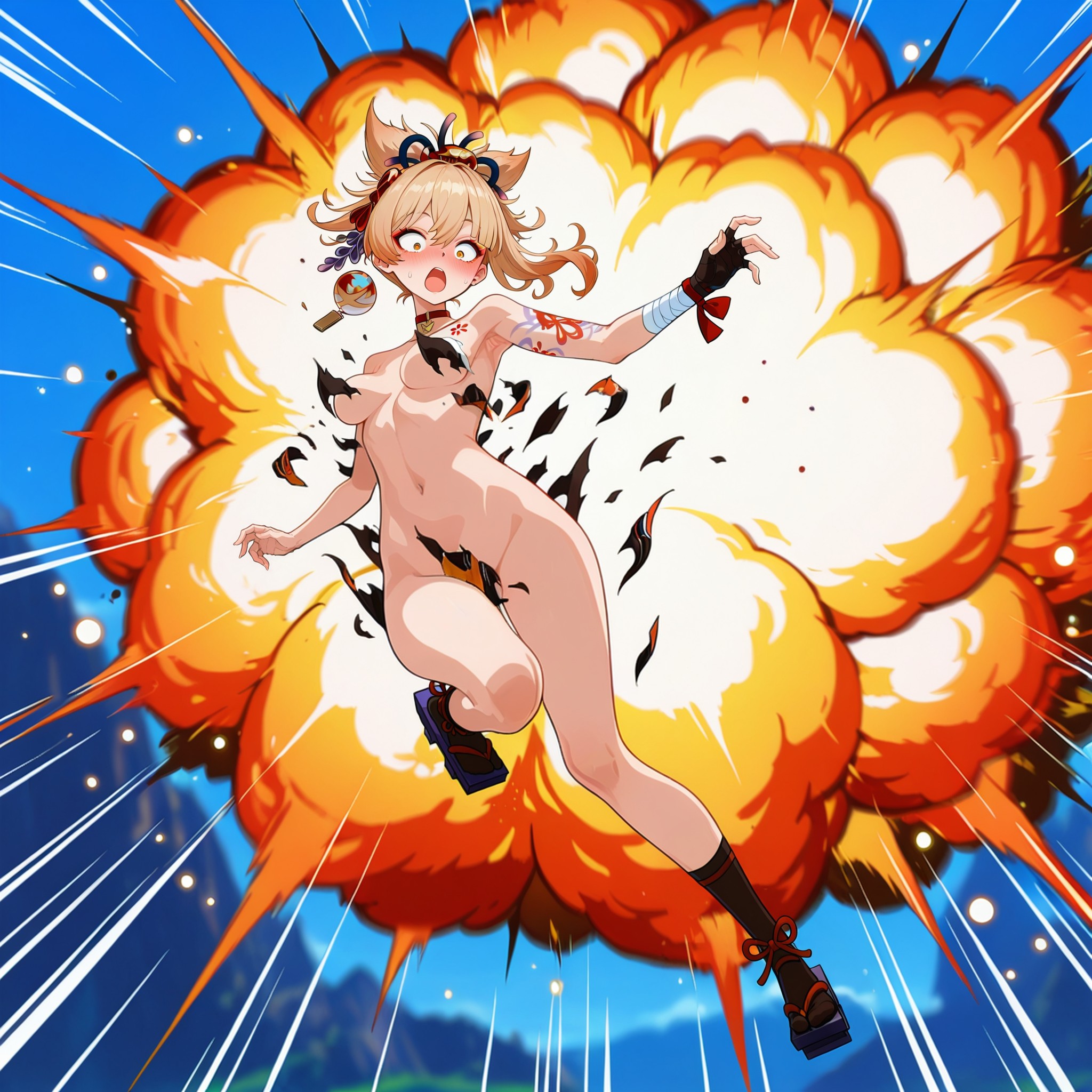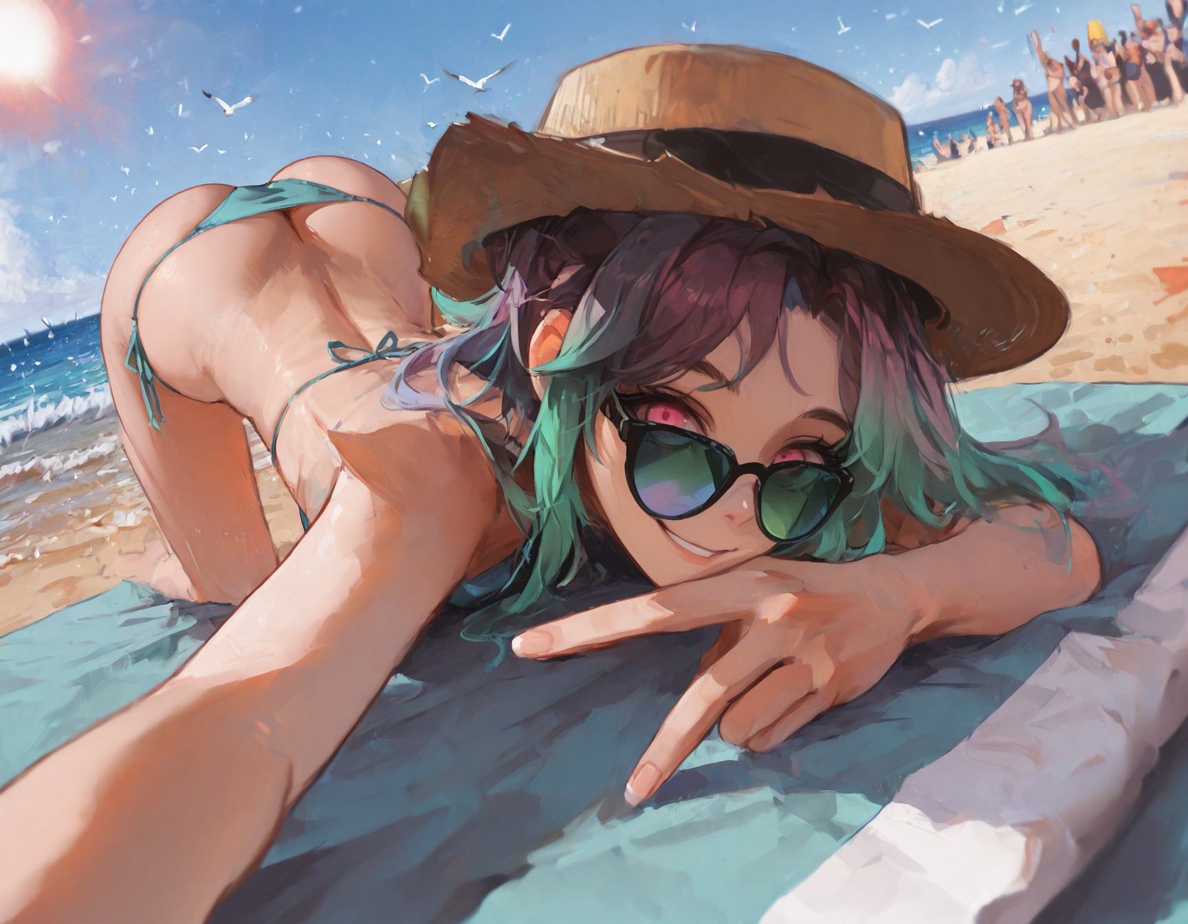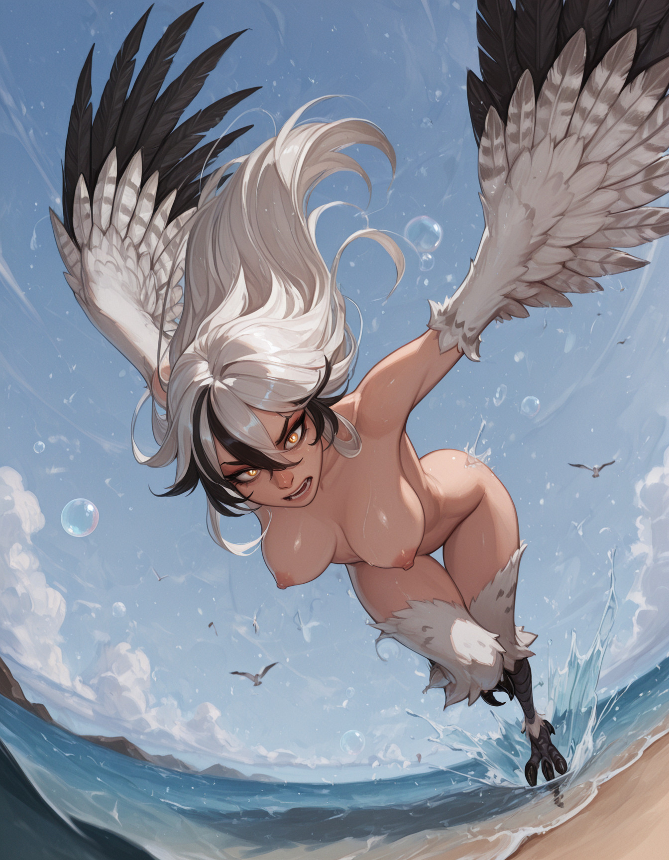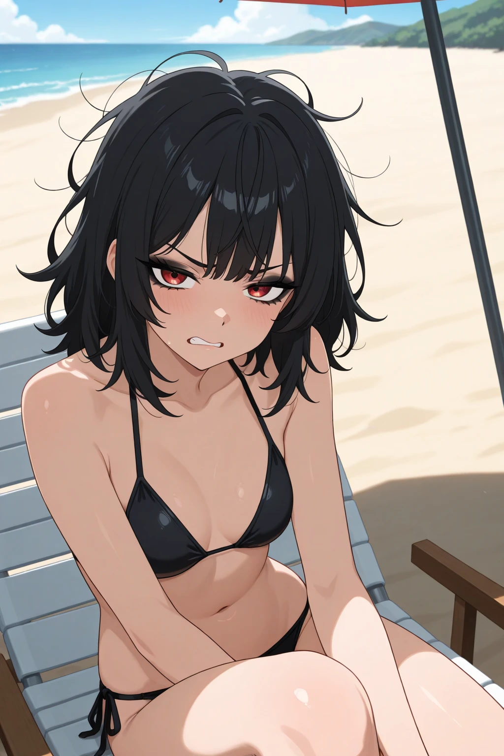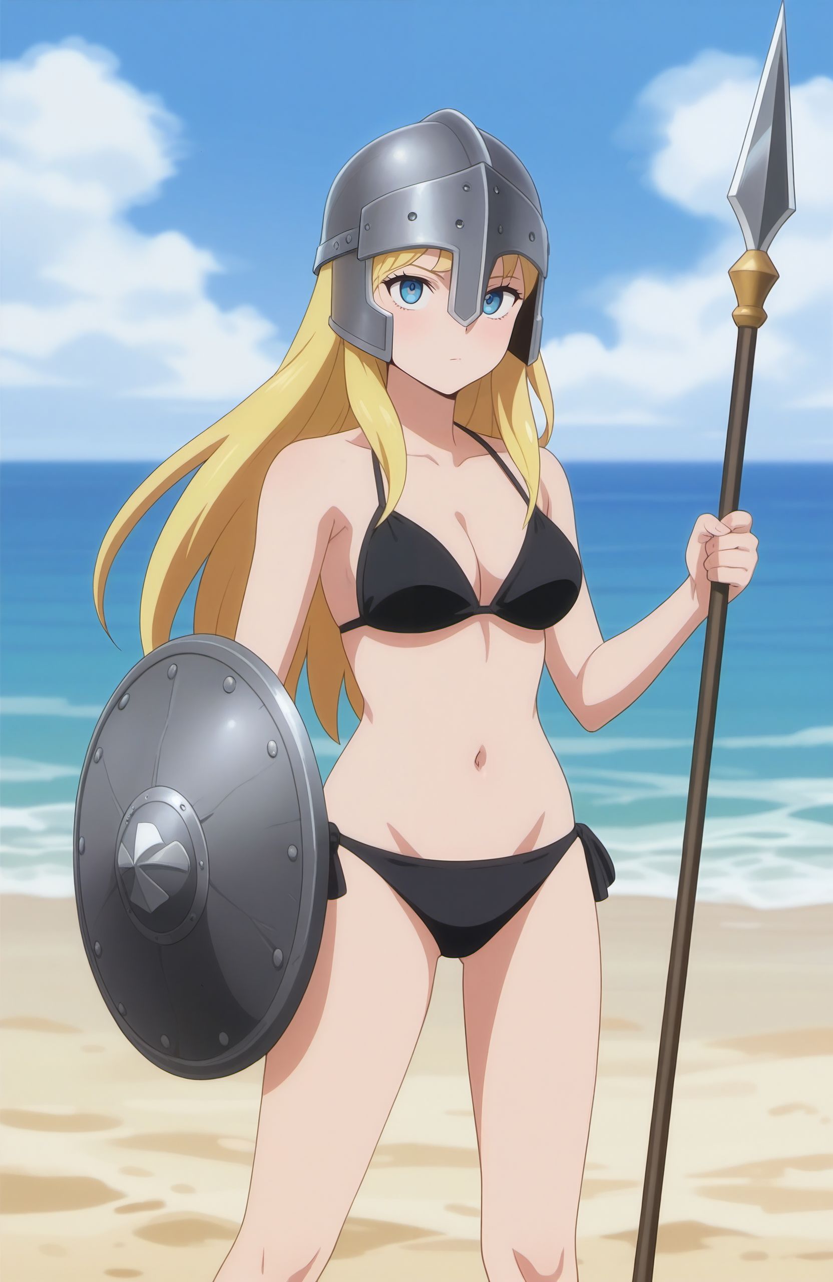 >>3034237Kaoruko Sazaki (Gundam) naked at the Beach. She is standing, legs apart. She opens the towel, revealing her naked body. She has a mischievous and provocative look in her eyes and looks at the viewer.