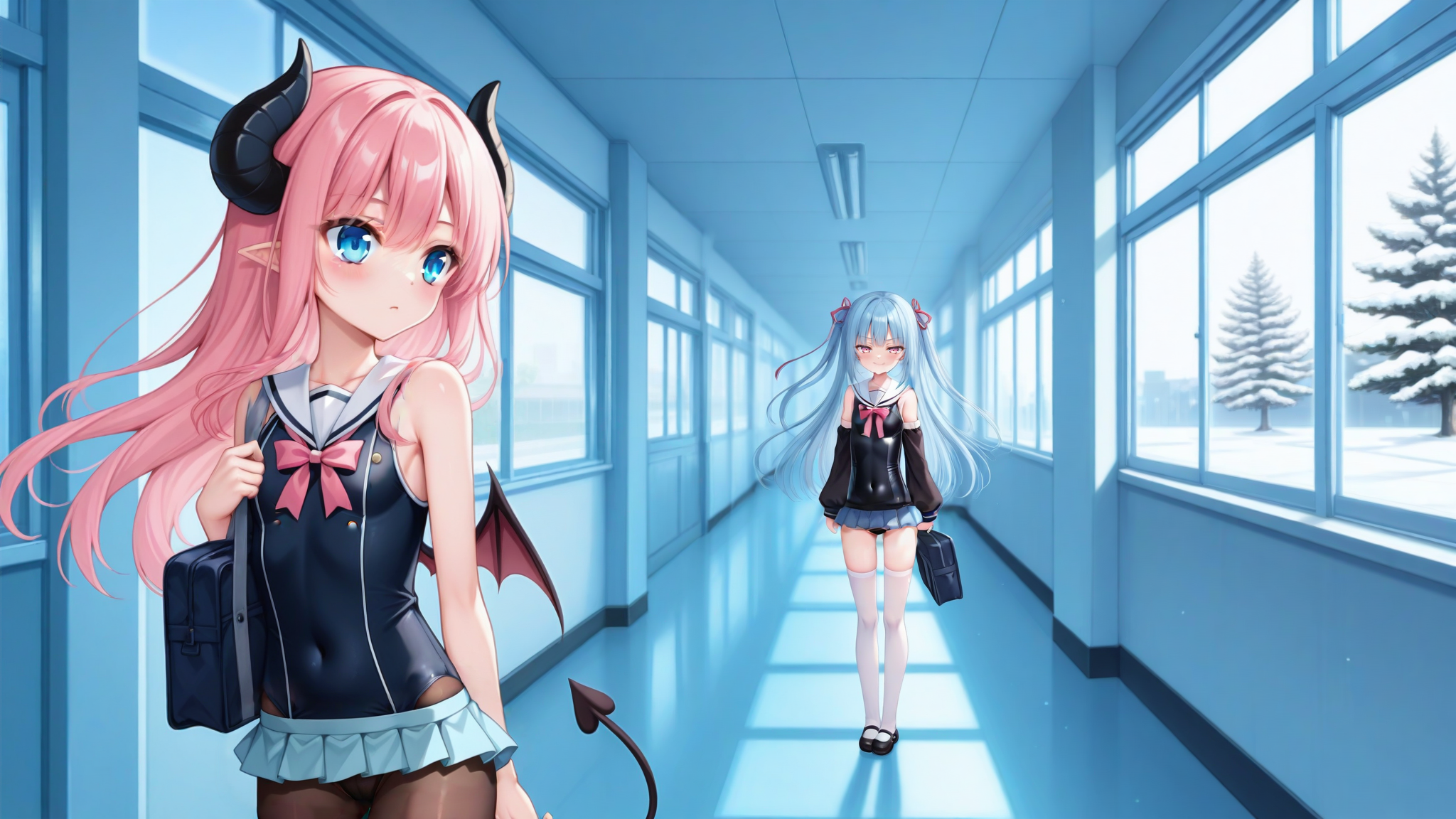 Struggled genning their school uniforms. I've never made a lora before but for their school uniforms, I think I'm done trying to coax it out of the checkpoint.Hallway of their school, winter uniform (sleeves!), last day of school for the year. Why Sakura looks so smug I dunno, I genned her for a smile but thought it was too fun to pass up. She's up to something. Maybe an after school party with the girls from class?