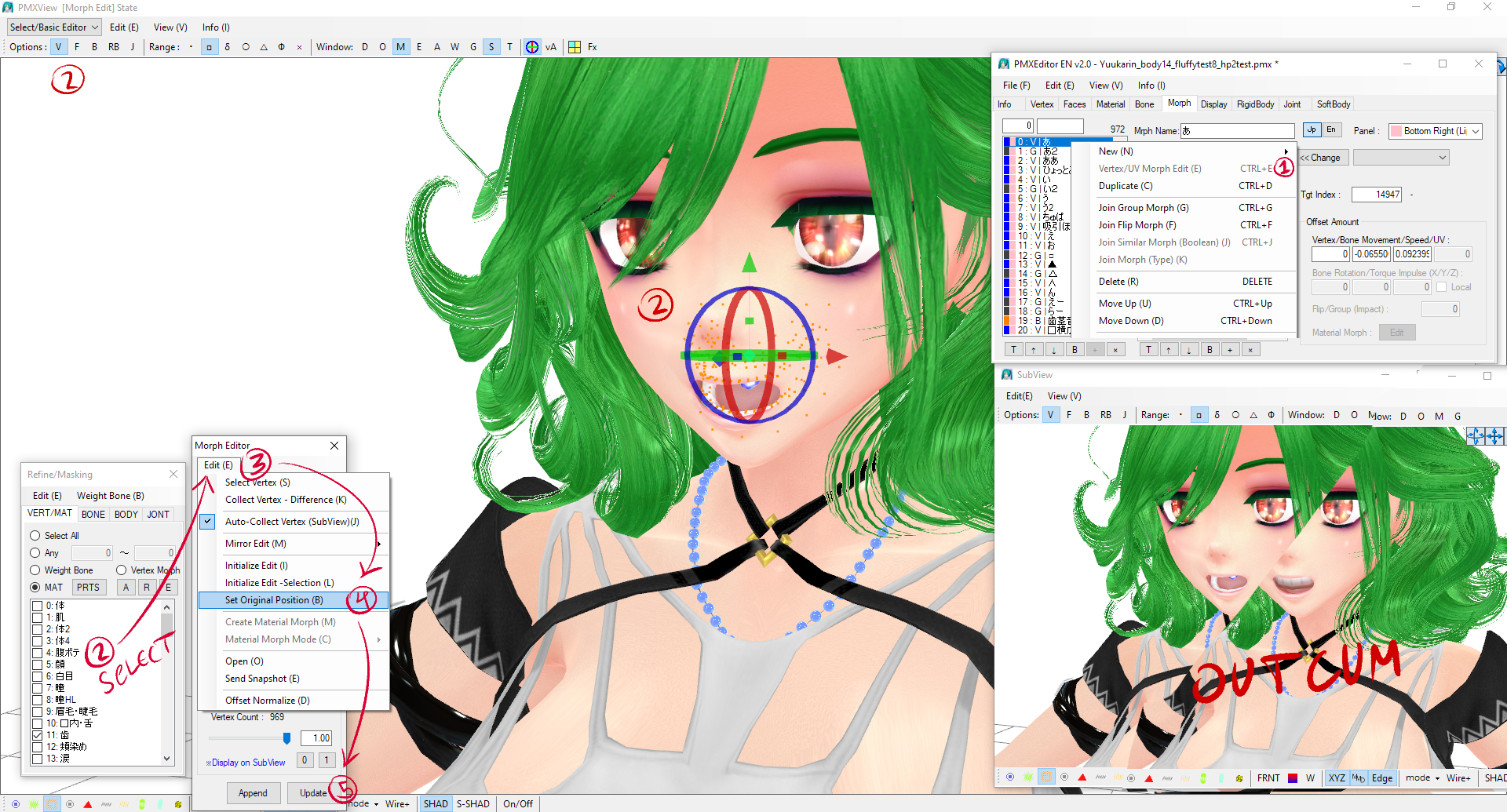 >>3063792Create a new vertex morph. Select a small area around the mouth symmetrically on the X axis without involving the teeth and tongue. Switch to Tension Movement B in PMXe > F2 > Handle Operation. Position the handle in front of the mouth by dragging the blue cube. Proceed to extend it by dragging the blue arrow. Don't overdo it. Then adjust as needed. Alternatively, you can use the standard handle's scaling function. If the head is angled and the mouth is not oriented horizontally, it's better to enable the virtual axis and first align the blue arrow with the angle of the mouth, although you can simply drag the selection down after dragging it forward. You can also look at Ademar's Izumi for a more advanced approach.Internal organ x-rays are often graphics, but cross-section models exist as well. It's not hard to make them yourself out of cylinder primitives (Ctrl+P).https://bowlroll.net/file/201998