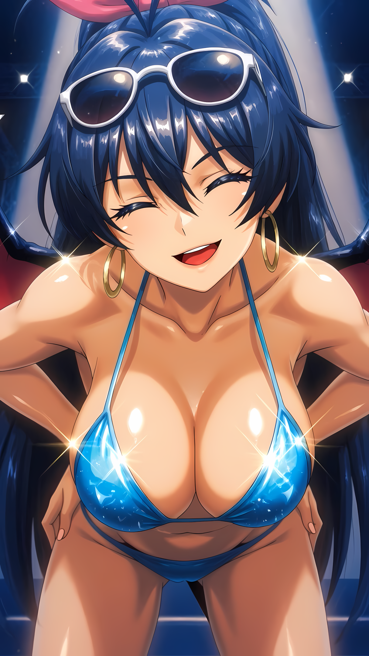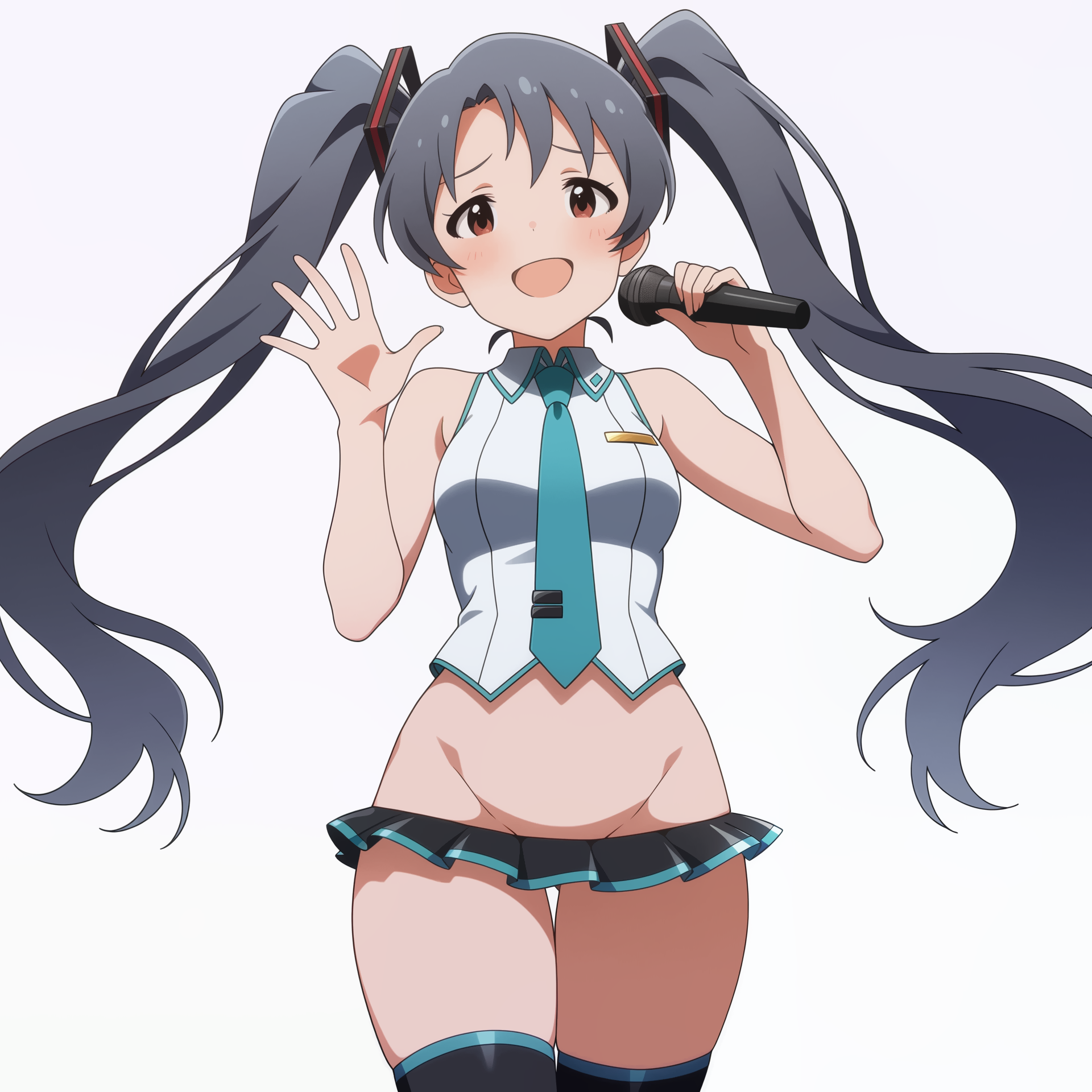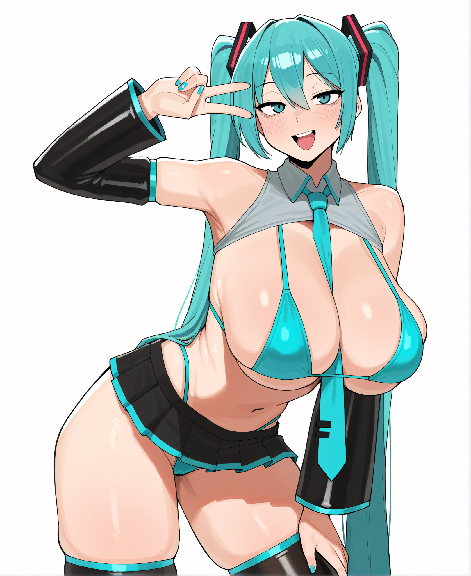 >>3058511artist:donburi \(donburikazoku\), (artist:ohasi:0.9), newest,masterpiece, best quality, amazing quality, very aesthetic, absurdres,1girl, solo, hatsune miku, vocaloid, aqua eyes, aqua hair, twintails, :d, upper teeth only, aqua nails, looking at viewer,curvy, thick thighs, huge breasts, perky breasts, miku collar bikini, microskirt, black skirt, detached sleeves, bikini under clothes, highleg bikini, aqua bikini, black thighhighs, skindentation, aqua necktie, necktie between breasts,facing viewer, standing, legs apart, contrapposto, hand up, v over eye, hand on own leg, feet out of frame,white background,