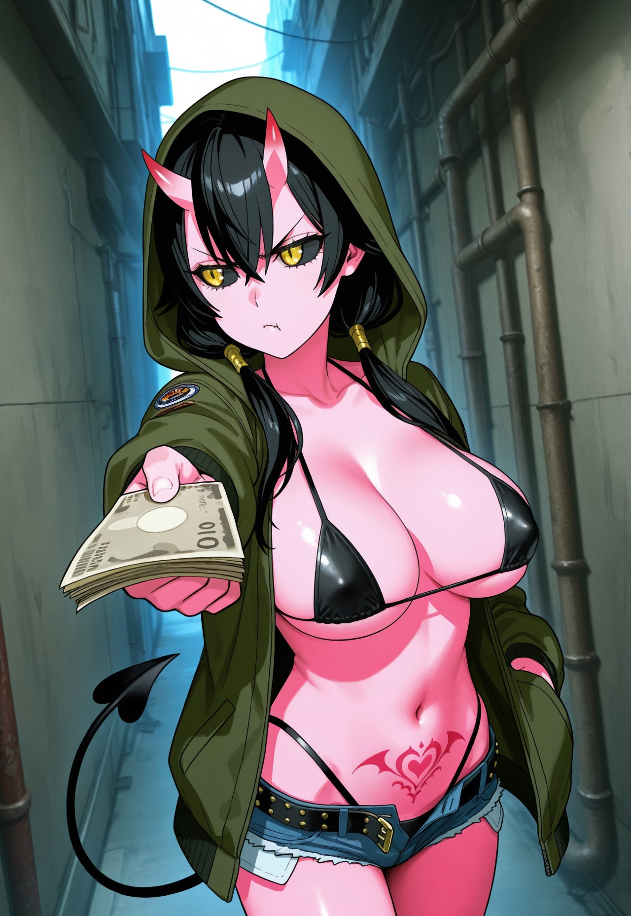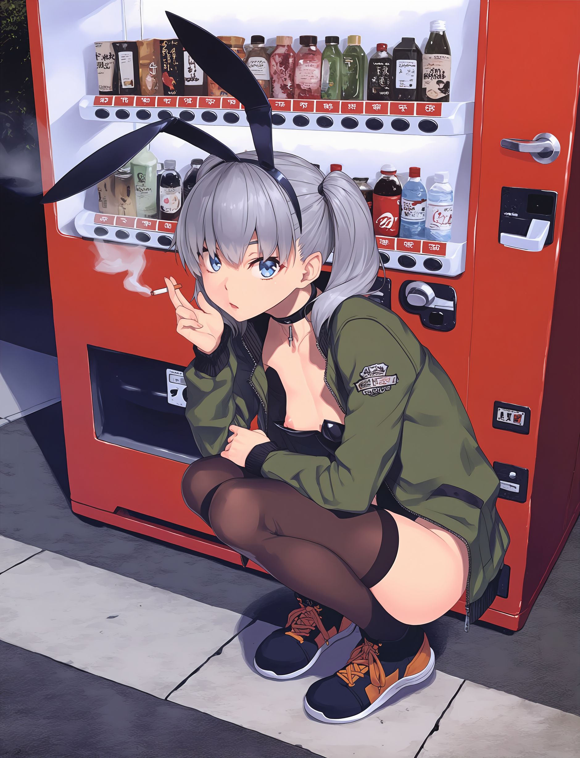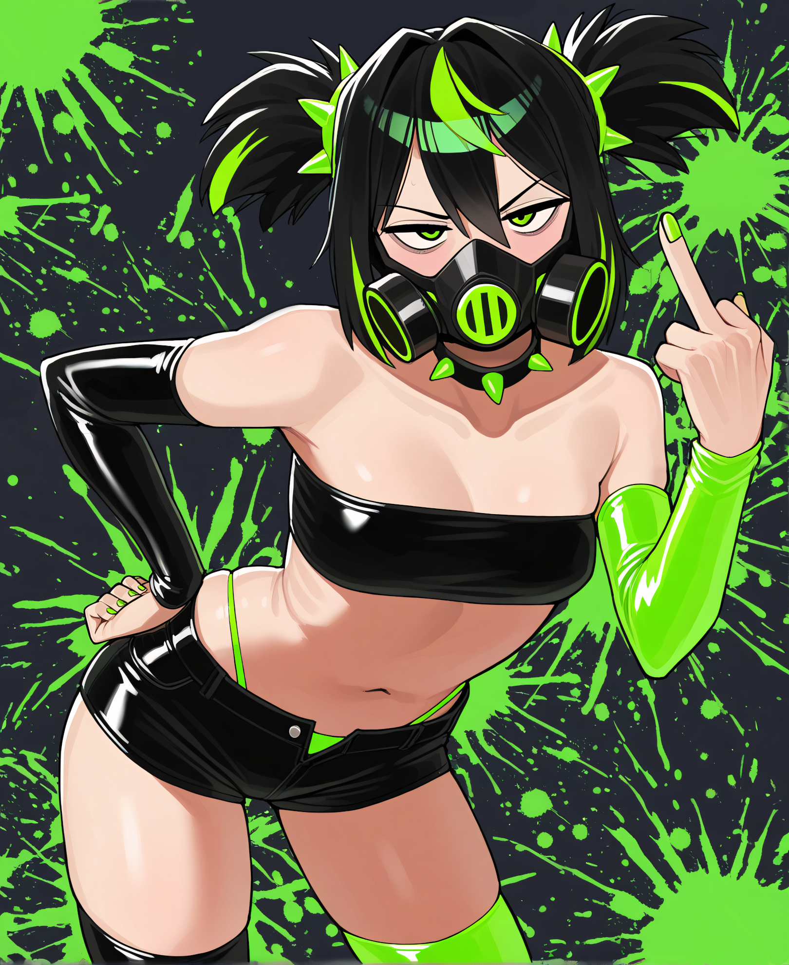 >>3058511artist:donburi \(donburikazoku\), (artist:ohasi:0.9), newest,masterpiece, best quality, amazing quality, very aesthetic, absurdres,1girl, solo, hatsune miku, vocaloid, aqua eyes, aqua hair, twintails, :d, upper teeth only, aqua nails, looking at viewer,curvy, thick thighs, huge breasts, perky breasts, miku collar bikini, microskirt, black skirt, detached sleeves, bikini under clothes, highleg bikini, aqua bikini, black thighhighs, skindentation, aqua necktie, necktie between breasts,facing viewer, standing, legs apart, contrapposto, hand up, v over eye, hand on own leg, feet out of frame,white background,