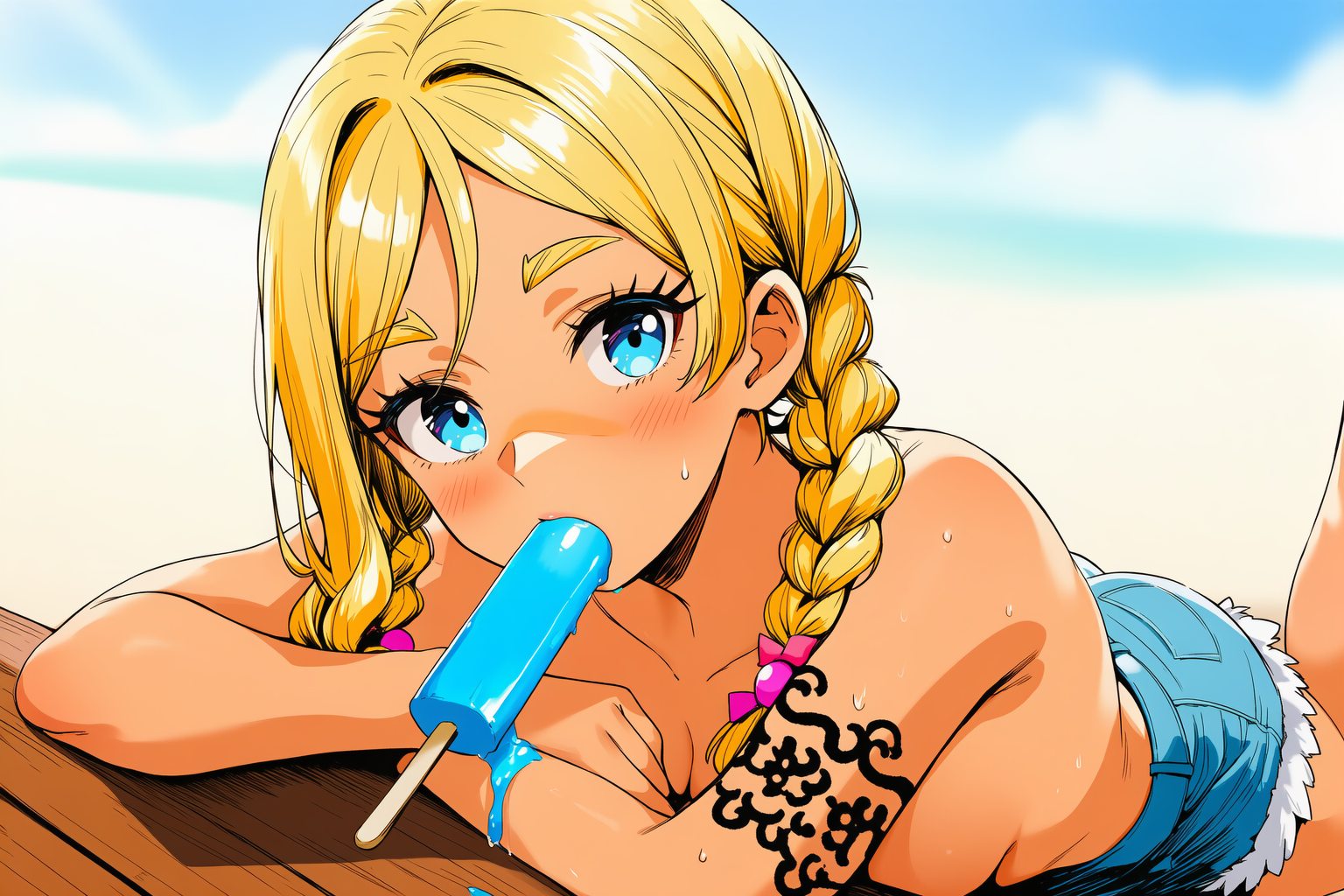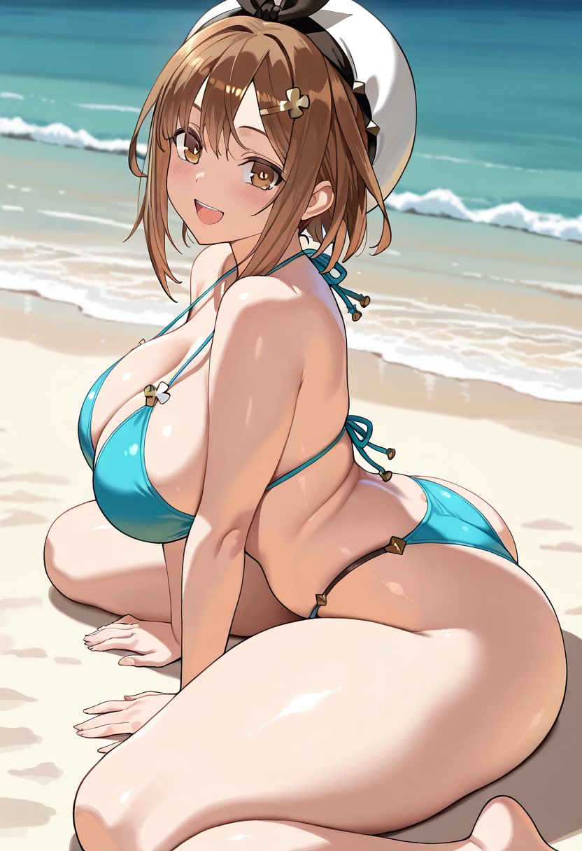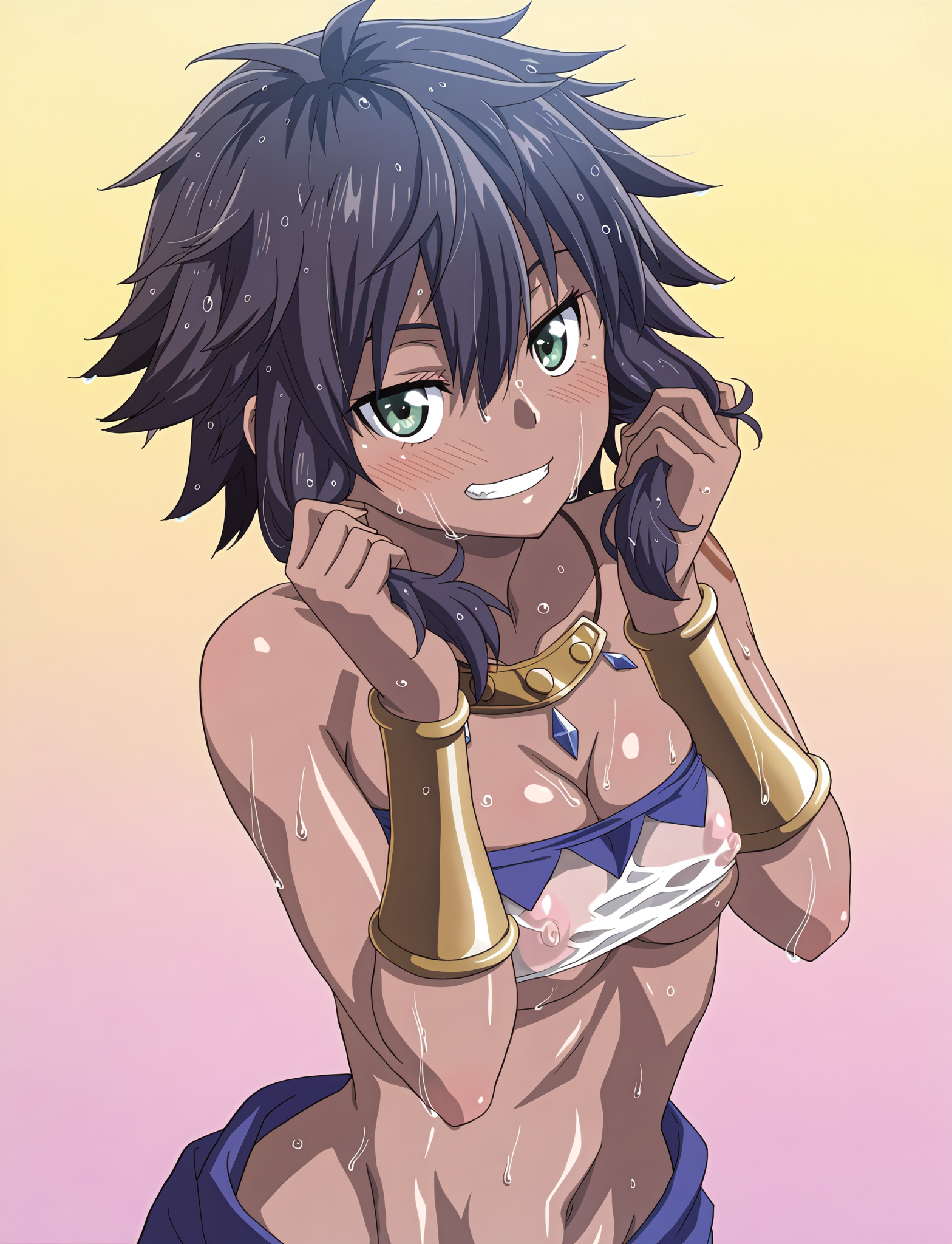 >>30586181girl, solo, kikuchi makoto, short hair, black hair, antenna hair, purple eyes Micro bikini, small breasts, (lowleg bikini bottom:1.3), pubic hair, Beach, towel, lying on back, blush, embarrassedUsed a Makoto Lora too