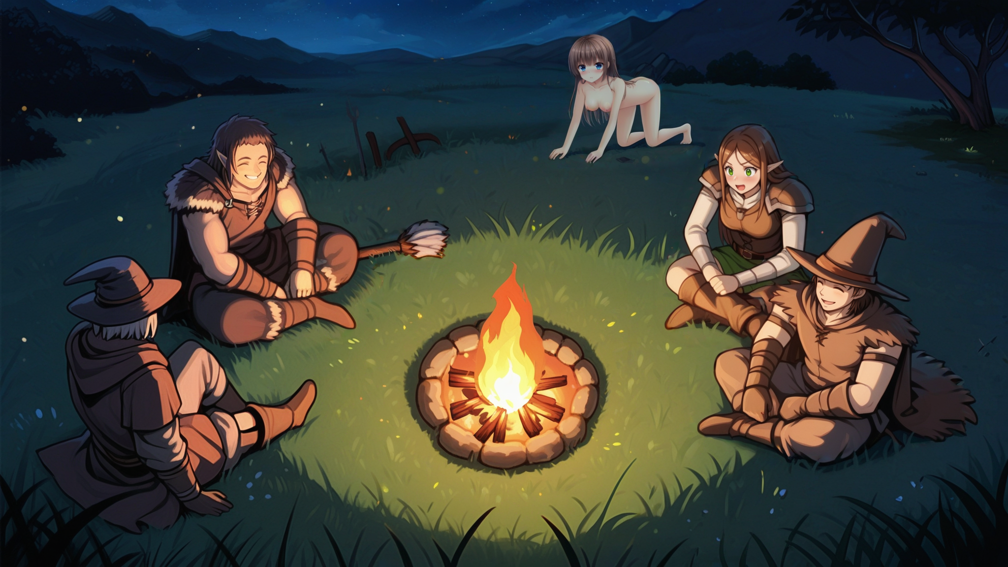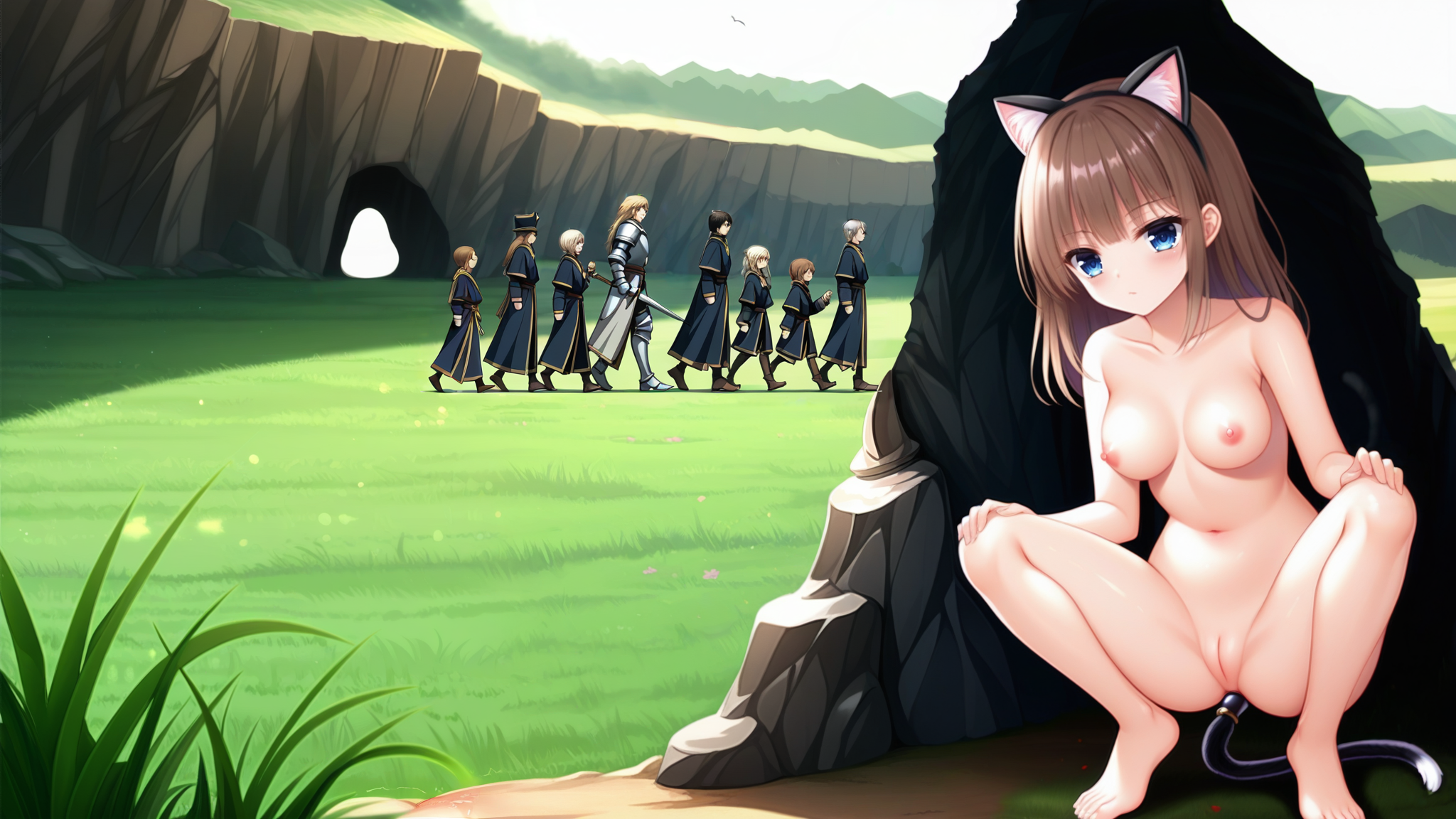 >>3058398>Got any tips?Next time paint cave depths black instead of white?Local imagegen is just generally bad at wide shots with characters far from the camera. You can run a low denoise inpaint pass over them once they're pasted in, so they blend better in terms of artstyle and shading.