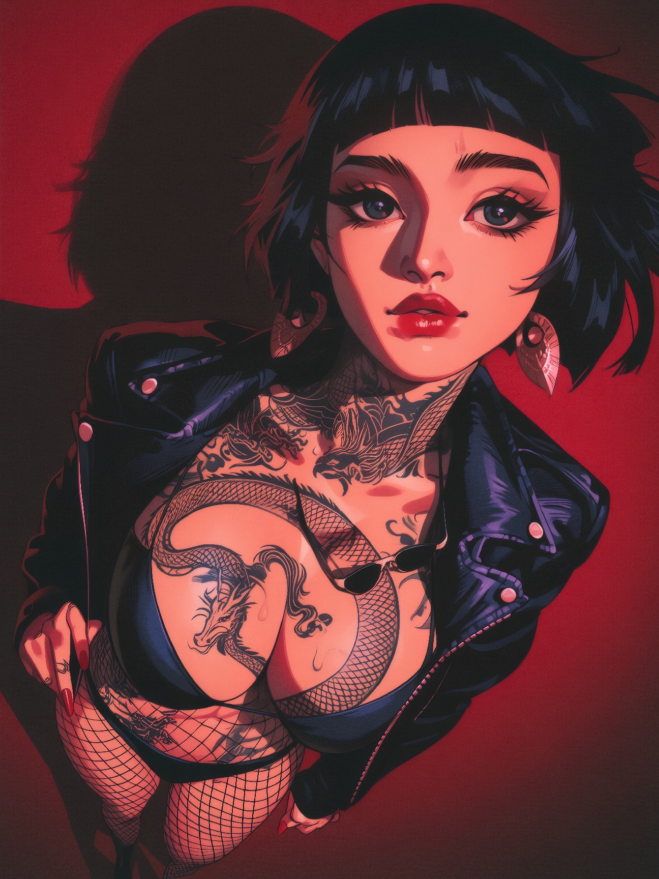 >>3065421@nonshitartist, @2ndnonshitartist,@3rdfavoriteartist, sexual look, bikini top, leather underwear, fishnet tights, red fingernails, red theme, from above, hime cut, black hair, short hair, leather jacket, partially exposed breasts, narrow waist, slim, jewelry, earrings, dragon tattoo, ((covered in black tattoos)), wide angle, fisheye effect, shadows, face close-up, face focus,