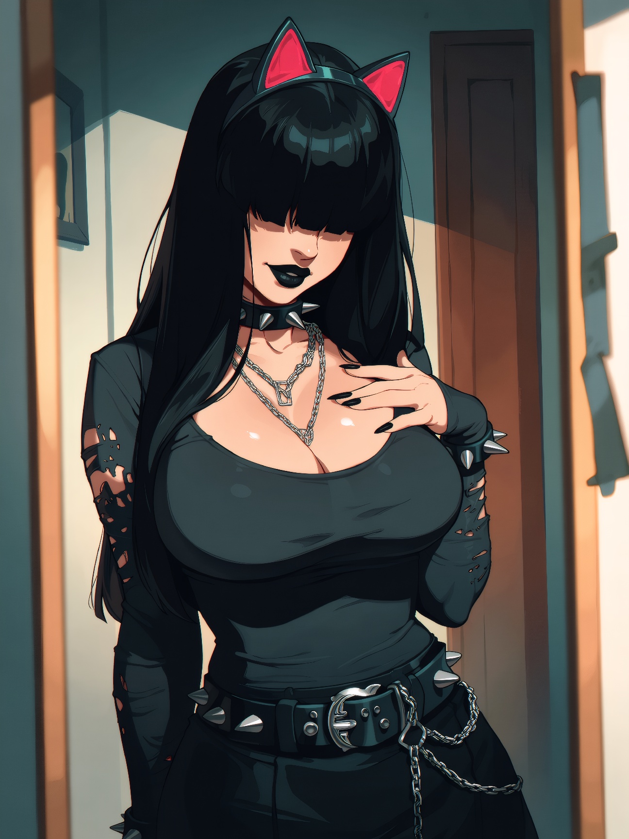 >>3065579no artists, just rolling a seed.long hair, round breasts, (perky breasts, huge breasts), black hair, long sleeves, cleavage, jewelry, standing, cowboy shot, skirt, indoors, belt, blunt bangs, necklace, nail polish, black skirt, collar, bracelet, fingernails, lips, makeup, chain, black nails, hand on own chest, lipstick, facing viewer, black belt, spikes, mirror, door, hair over eyes, covered eyes, tight clothes, spiked collar, spiked bracelet, goth fashion, black lips, smirk, fake cat ears,\