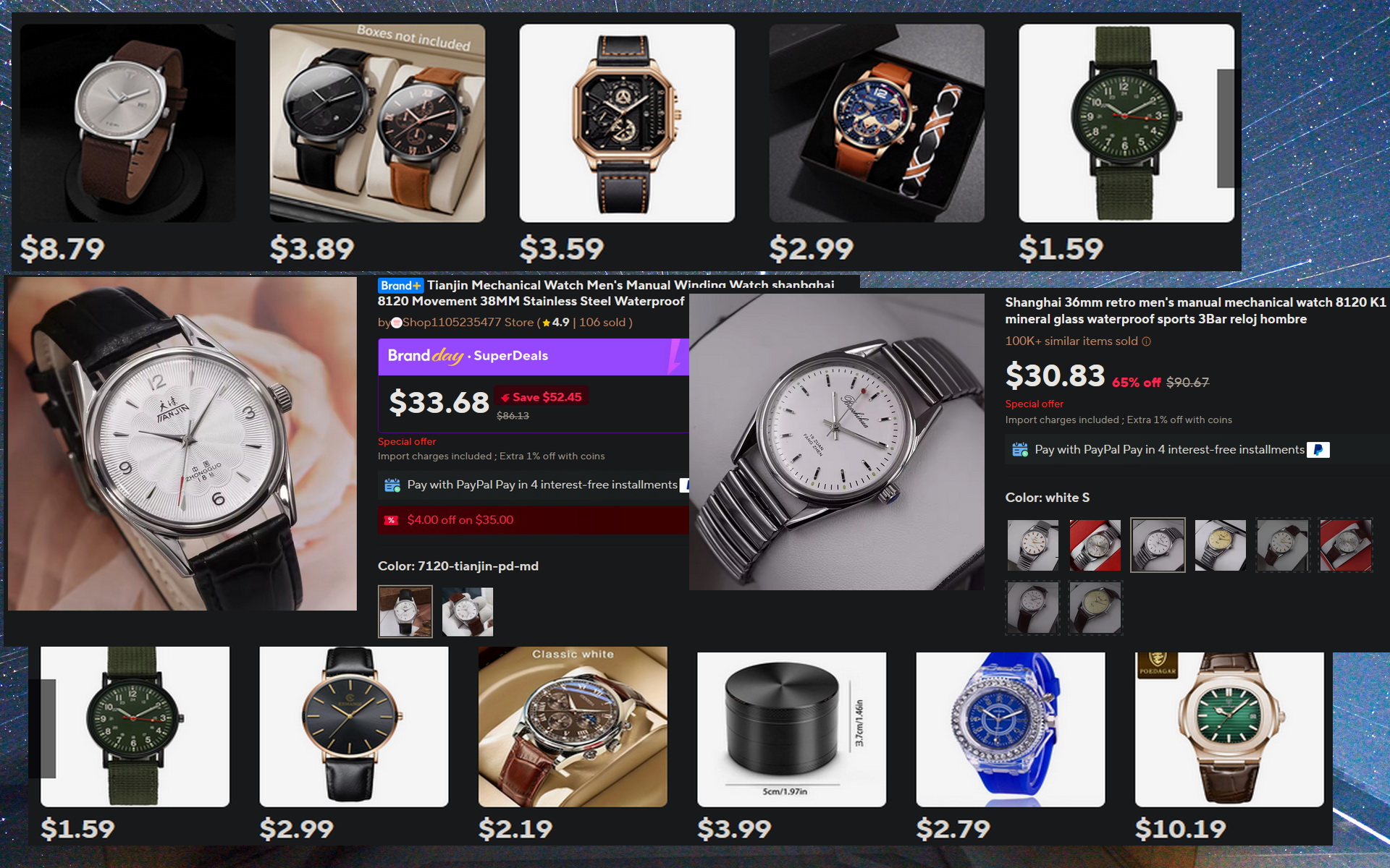 I'm still going to get that one "brand name" starter watch for around $300. That's my new max budget.But for now, as a palate cleanser after sending back ANOTHER Seiko 5, I've bought some more AliExpress shitters. As my taste evolves I'm trying new things. They're cheap enough to afford to. Some are cheap and some are really fucking hilariously cheap. But I don't regret any of them.Say what you want, keep telling me I'm "wasting" my money and need to drop over $1K on a single watch.But I'm not there yet. And how will I ever get there if I don't keep trying new watches I like? You do it your way with your money, and I'll do it my way with mine.This is fun to me. The browsing, the research, the discussion. Any watch I'm paying more than $25 for has gotten good reviews by people who aren't shills. Any watch I'm paying less than $10 for is just a goof. Who fucking cares? People pay more than $10 for LUNCH now. Lunches don't last. We're learning that some of these shitters do. I've only been here a couple of weeks but I really like the board. You can be a snob at me all you like. I can take it. In fact I find it amusing. For the rest of you, thanks for welcoming me with all of your valuable advise. I'd be NOWHERE without what I've learned here.I just bought all of these in my image. The two in the middle are the cheapest hand-wound mechanicals that are supposedly well made.