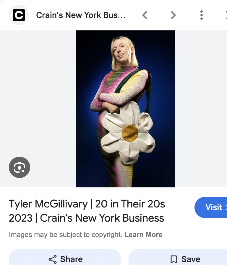 Fashion Designer Tyler McGillivary uses slave labor in India factories to make cheap overpriced clothing to sell here. She is secretly a lesbian. The more you know.