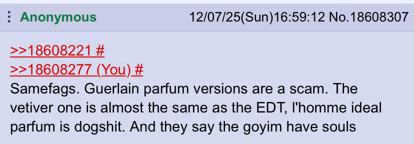>>18608307>Guerlain parfum versions are a scamcorrect>The vetiver one is almost the same as the EDTcorrect>l'homme ideal parfum is dogshit.correct>And they say the goyim have soulsretarded, literally no one says that
