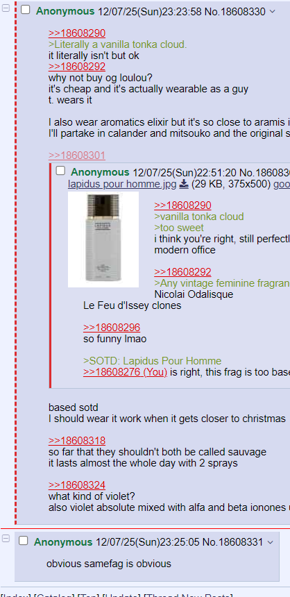 >>18608290>vanilla tonka cloud>too sweeti think you're right, still perfectly safe for the modern office>>18608292>Any vintage feminine fragrances you wear?Nicolai OdalisqueLe Feu d'Issey clones>>18608296so funny lmao>SOTD: Lapidus Pour Homme>>18608276 is right, this frag is too based for bugmen