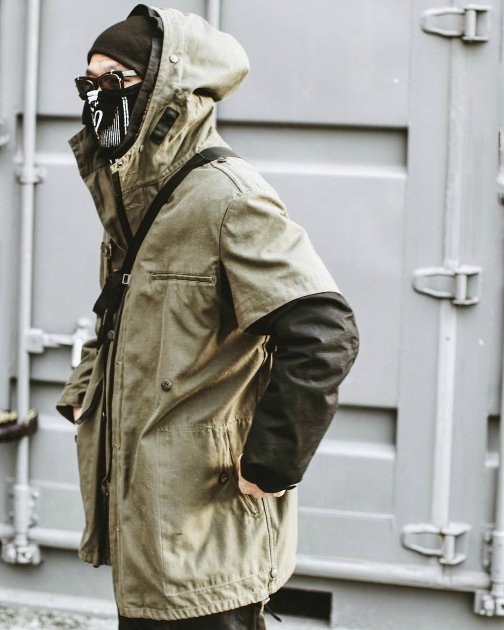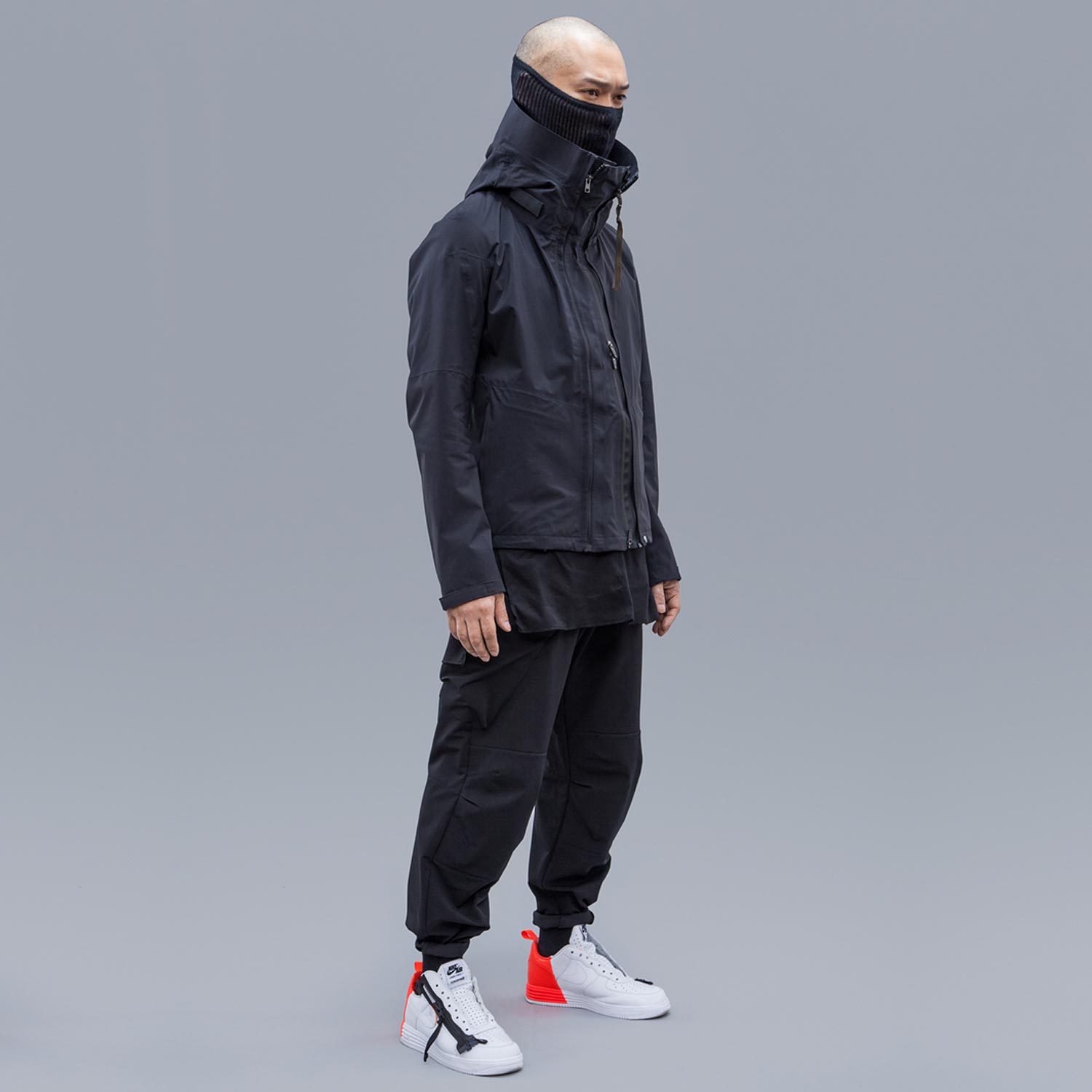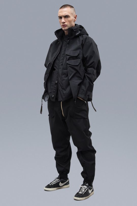 how to techwear:- bad posture, forward lean, hands in pockets- black or grey synthetic clothes, all in same color- pants with ankle cuffs- serious expression and sharply styled hair if attractive, otherwise face mask and sunglasses