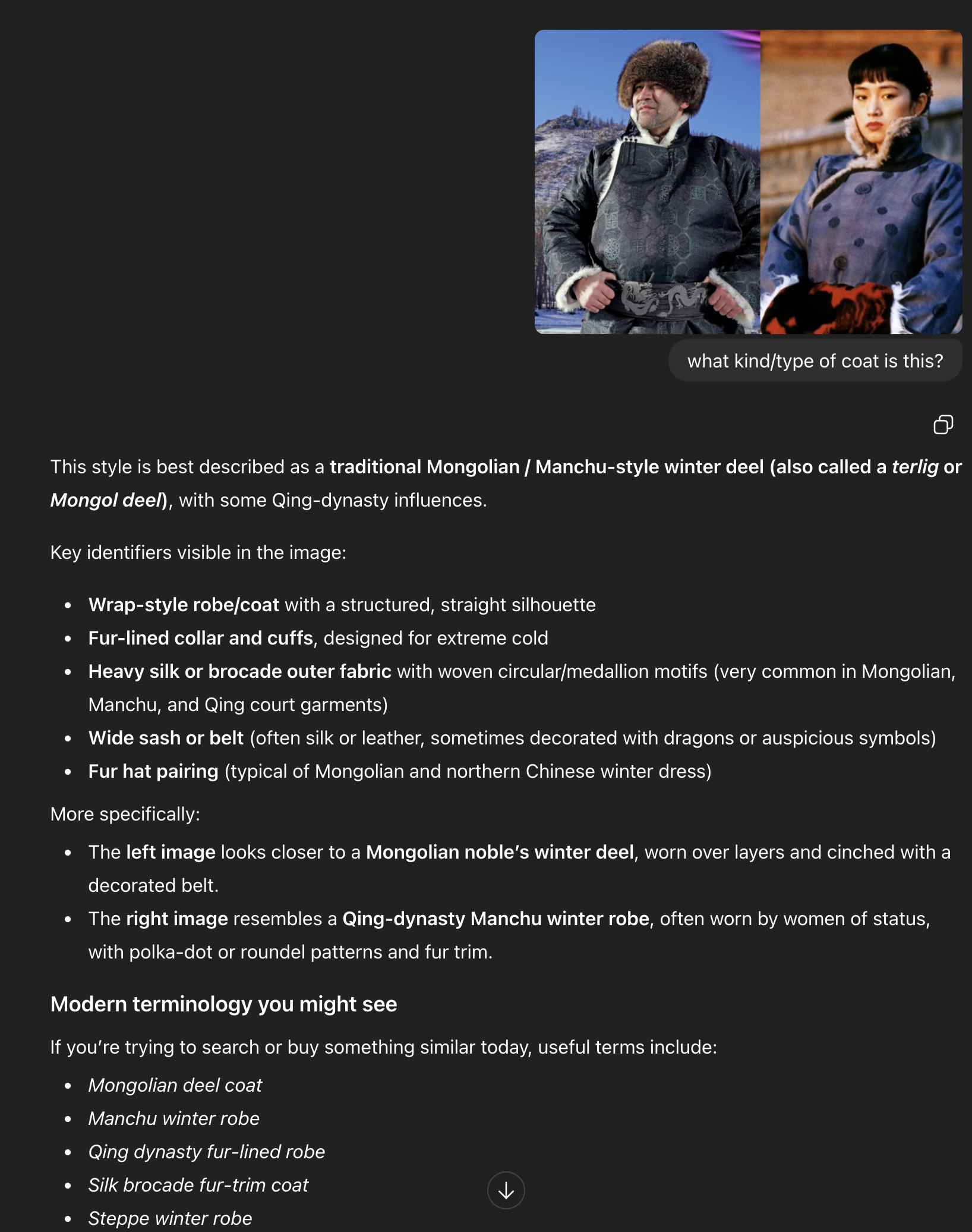 Anybody knows what kind of coat they're wearing? Something mongolia probably, but with a high collar