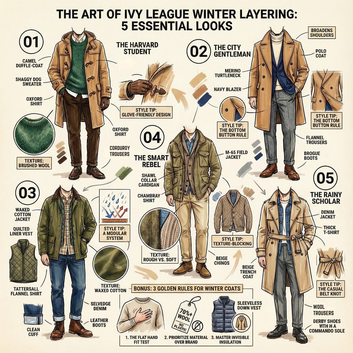 >>18626198Looks good but I wouldn't wear a trench coat with denim. 3, 4 and 5 are also mid-season wear in my climate.