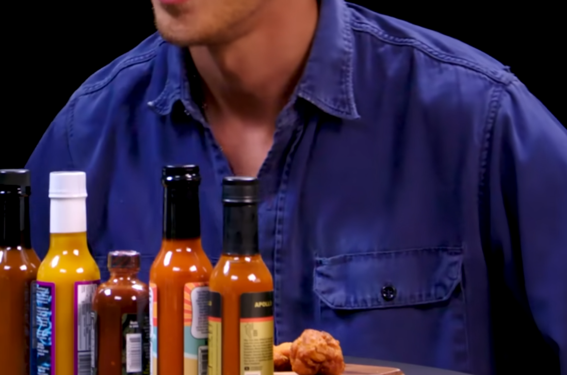 >What shirt was Austin Butler wearing here on Hot Ones?