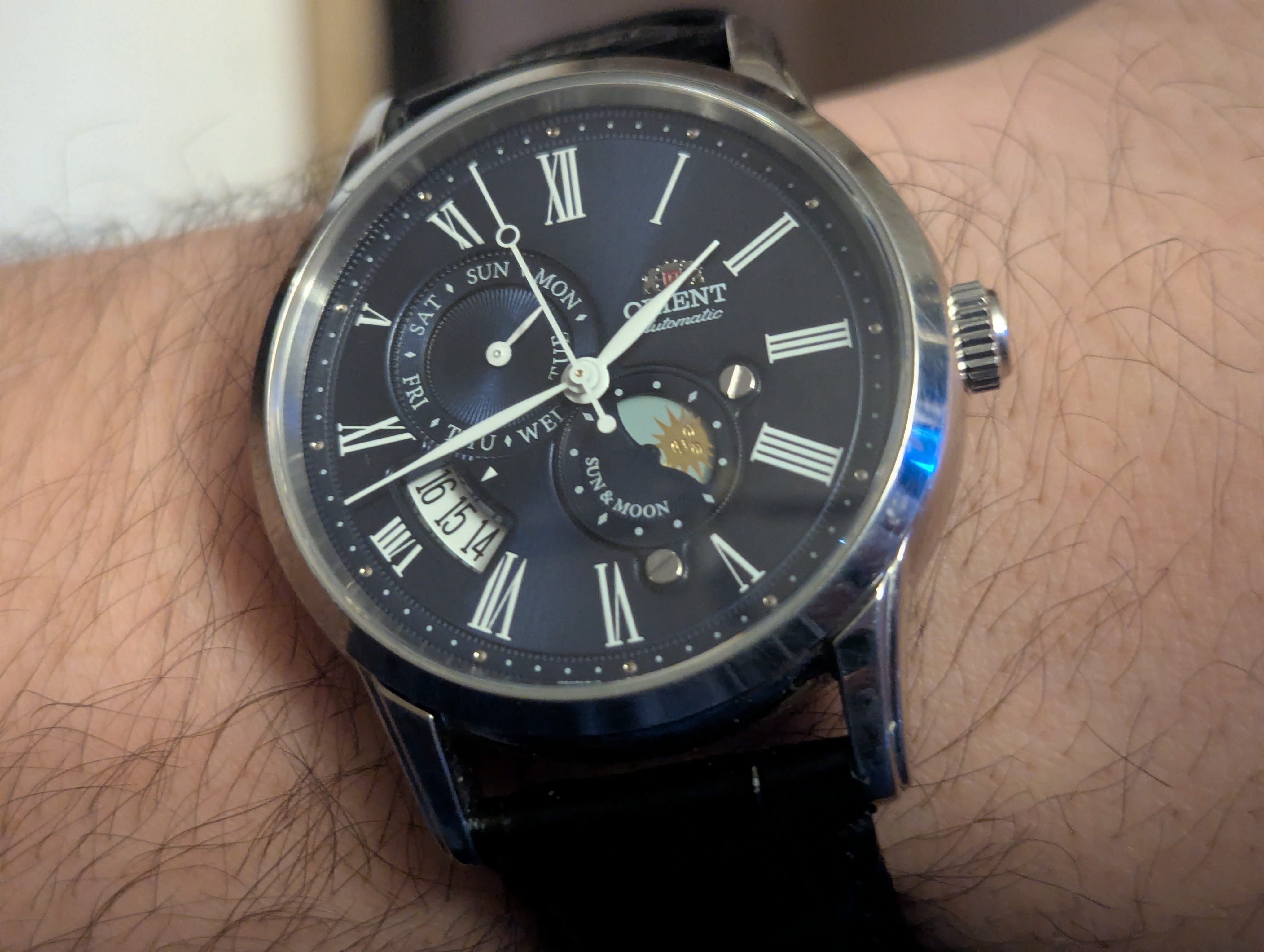 >>18635785Thats a counterfeit watch. Orient doesn't produce that model. Its fake. Thats why its was $45.00. Are you slow?