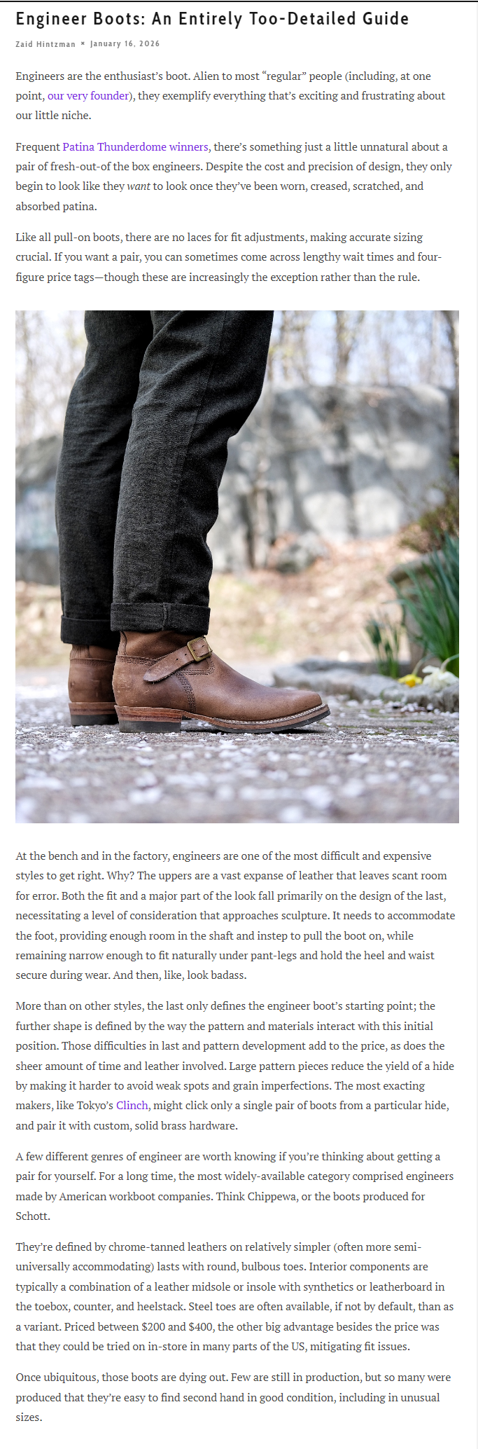 /btg/ BOOT GENERAL - ENGINEERS EDITIONWhat do I need to care for my boots?>Old cotton t shirt (one for cleaning, another for applying conditioners)>Horsehair brush ($10-15)>Wooden shoe trees ($10-15)>Light conditioner like Lexol/Bick4/renovateur>Heavy conditioner (if you live in terrible snow/rain areas) Sno seal/Obernauf LP>Don't forget that boots need time to dry properly, rotate them and rest themHow do I deal with x stain?>mud: allow it to dry then brush off>salt: water and cloth as soon as possible>saturated wet: allow the boot to dry for a full day, stuff with newspaper>scuffs and scratches: buff vigorously with horsehair brush>Should I buy turdsdays/soloshits/doc shitans?No they are filled with synthetic materials aimed at instant comfort but will not hold up to actual use.>b-b-but muh ecelebs on youtube said they're goodno. you will waste your time and money and still have uncomfortable footwear at the end of the day. spend the extra $100 and get something real.>Are Thursdays any good?no.Manufacturer Red Flags>Luxury>Bespoke>Sustainable>Vegan>Unknown leather source>Made in Chyna/Mexico/IndonesiaBoot Red Flags>Dainite (Get vibram v-bar instead)>C*rk/C*lastic>Zippers>Non gusseted tongues>Excessive/unnecessary seams>Combination/mixed material heelsBoot Brands NO>Turdsdays>Doc Shitters/Soloshitters>any Whatsapp makers in the far east>BlkbrdPREV>>18628521