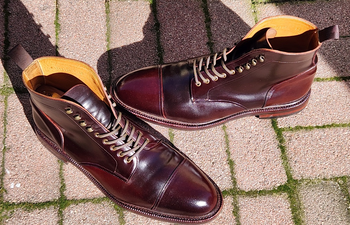 >>18638218Regular maintenance is brushing with a pig bristle/coarse brush to restore a hazy shine and brushing a horse hair/fine brush to sharpen the shine.When they don't shine up or they're looking/feeling dry, I apply very little Pure Polish cleaner/conditioner by hand, as opposed to on a cloth, let it set and then brush with the two brushes. The pictures are after cleaner/conditioner and brushing. For reference I've been using the same container of Pure Polish for all my boots and shoes for the last 4 or so years.