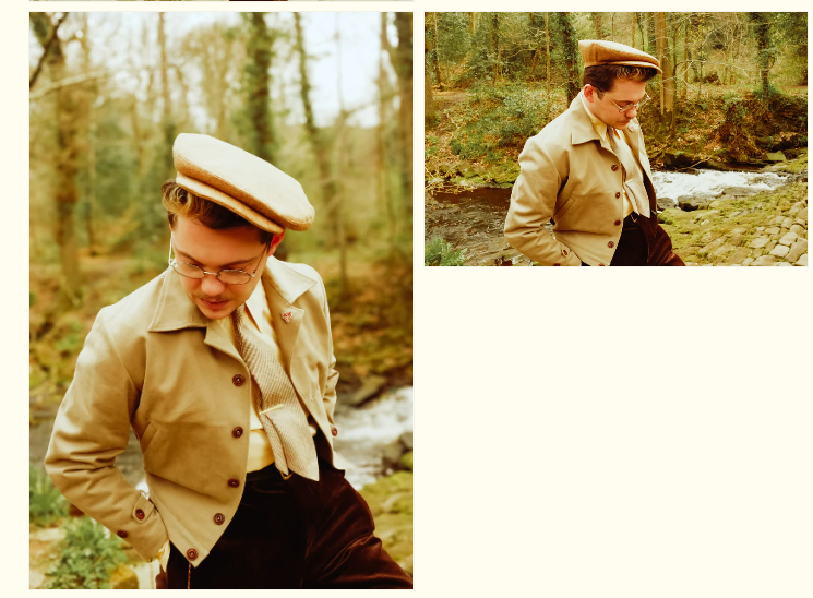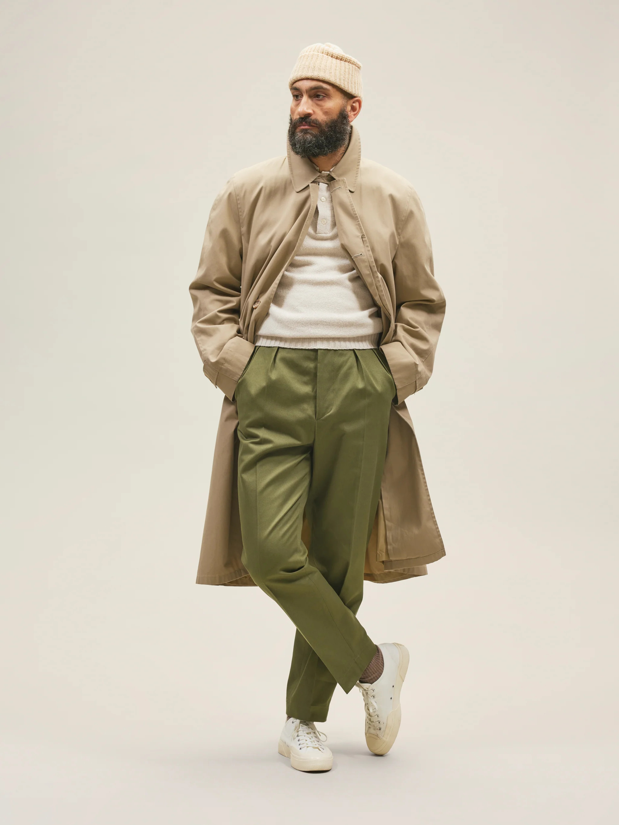 The actual outfit would be good if all the clothes were older, the modern sneakers, beanie, and sweater paired with slacks and coat make this clash so hard. It honestly hurts to look at.