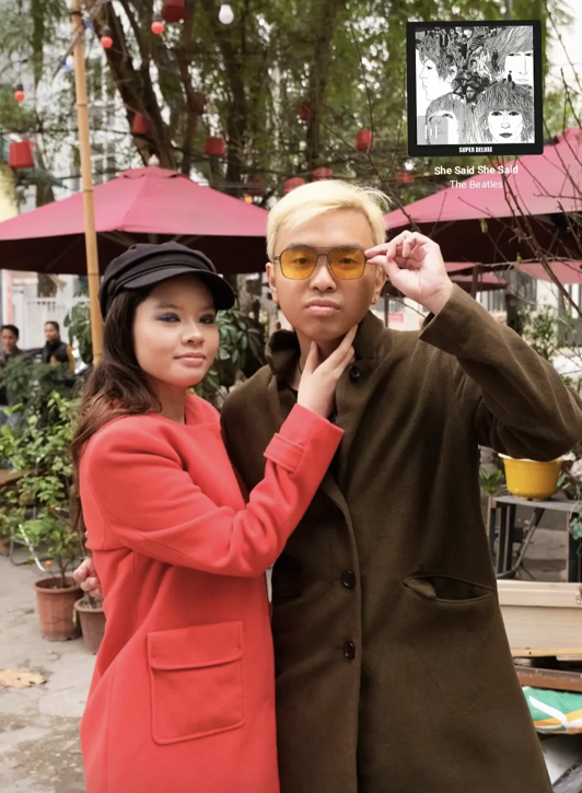 but I think it's just an Asian guy bleaching his hair. If he kept it dark it would look a lot better. The yellow glasses and brown overcoat are a good combo. Her outfit is good but she needs some pearls or a necklace or something. Jackie-Kennedy core.