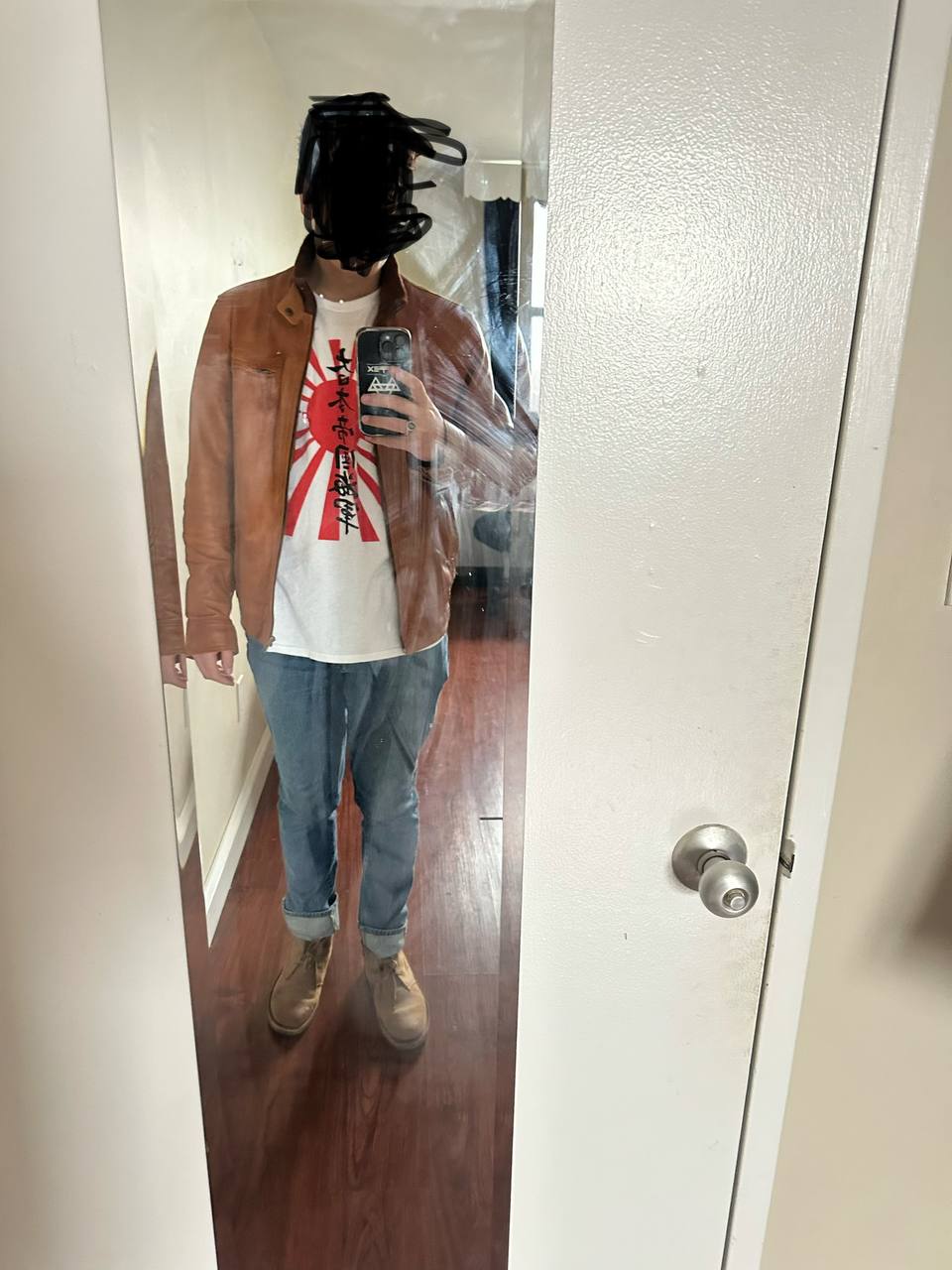 ugly boots, ugly jeans with an ugly fold, weirdo jap tshirt. Dripped?