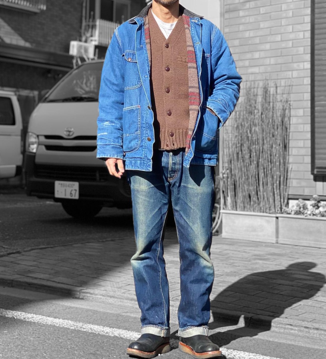 If you’re going to pull off double denim, do a type I or II jacket. Both of those have a boxier cropped cut, whereas the Type III is too slim and will give you more of that unflattering skinnyfat millenial silhouette. Some people say to avoid the same shade of indigo with both the top and bottoms, but I personally don’t think it’s that big of a deal compared to how well both the jeans and jacket complement your proportions and what color you’re contrasting with beneath the jacket. You will not find a better Type I or II cut than the Freewheelers stuff