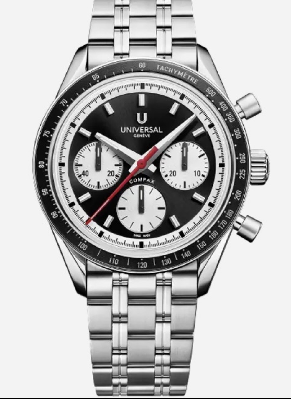 Universal Geneve Compax is back.I’ll admit, I was expecting Breitling to fuck it up, but this is good.39.5 x 47.8 x 12.5mm100m WR, 72hr PR, in-house micro-rotor movement w/ column wheel and vertical clutch.17k CHF steel on bracelet.