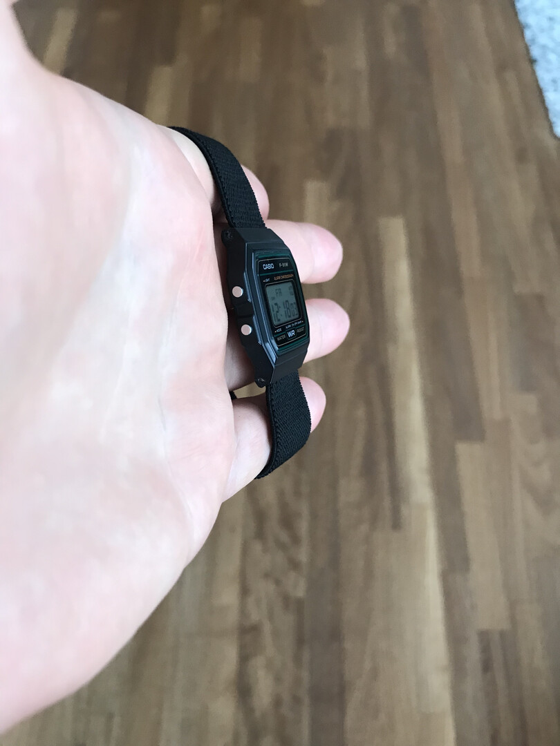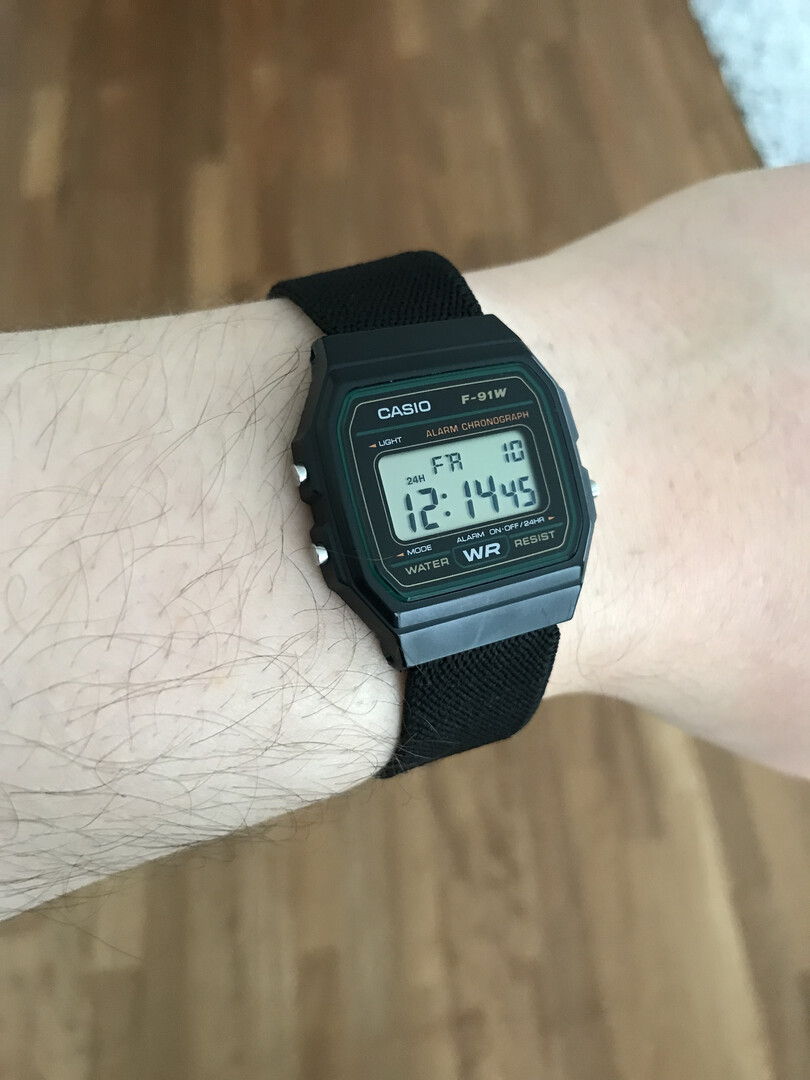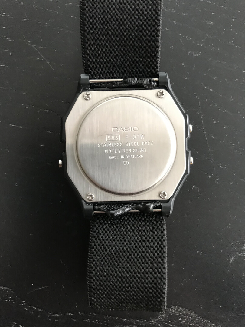 >>18682383 (You)The story is, my wrist is too thick for the default F-91W. The buckle ends up on the side and the watch always goes off center to the side too. Yet I liked how thin and light the watch was. Then I found a flexible strap in my mom's tailoring box. At first I decided to make a proper strap, but eventually I simplified the design until it was nothing more than simply a single piece of strap with ends melted off until it was left with the perfect size and nothing else. The friction of the bars holds the strap. The melted blobs prevent it from going out. It's crazy but the end result is optimized for pure thin comfort. The ultimate under the cuff, out of the way watch. I could sew the ends but I didn't need to yet. Of course I'm not scared of losing the watch. Pure performance.